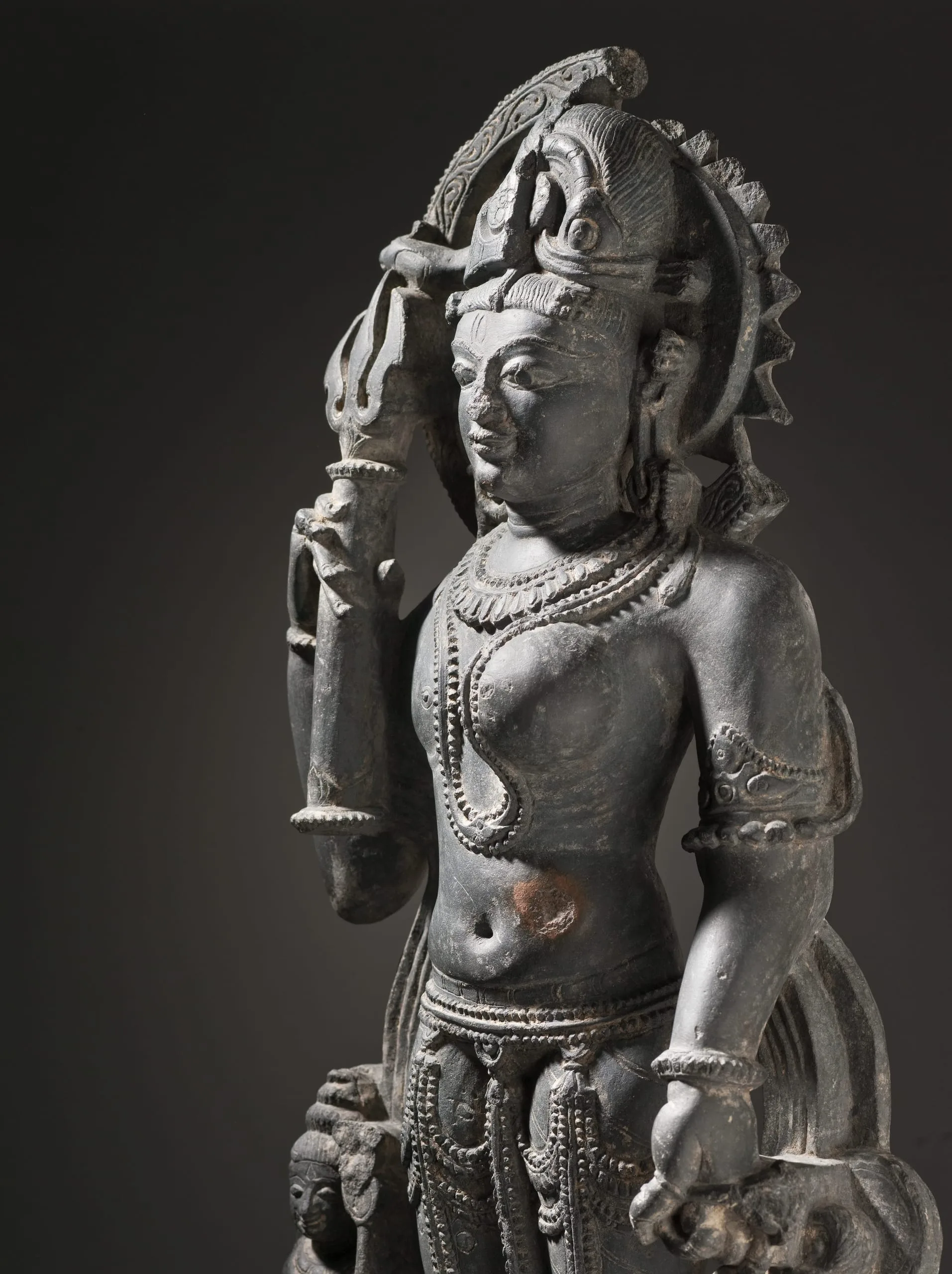 This image depicts the combined forms of Shiva and Parvati, known as Ardhanarishvara ("the lord who is half woman"). According to one myth, the Hindu god of creation Brahma neglected to create women. Shiva corrected this oversight by turning the left side of his body into a woman. The two halves eventually separated and engendered all of humankind. The androgyne is a symbol of perfect union and emphasizes the nonduality of the divine principle.