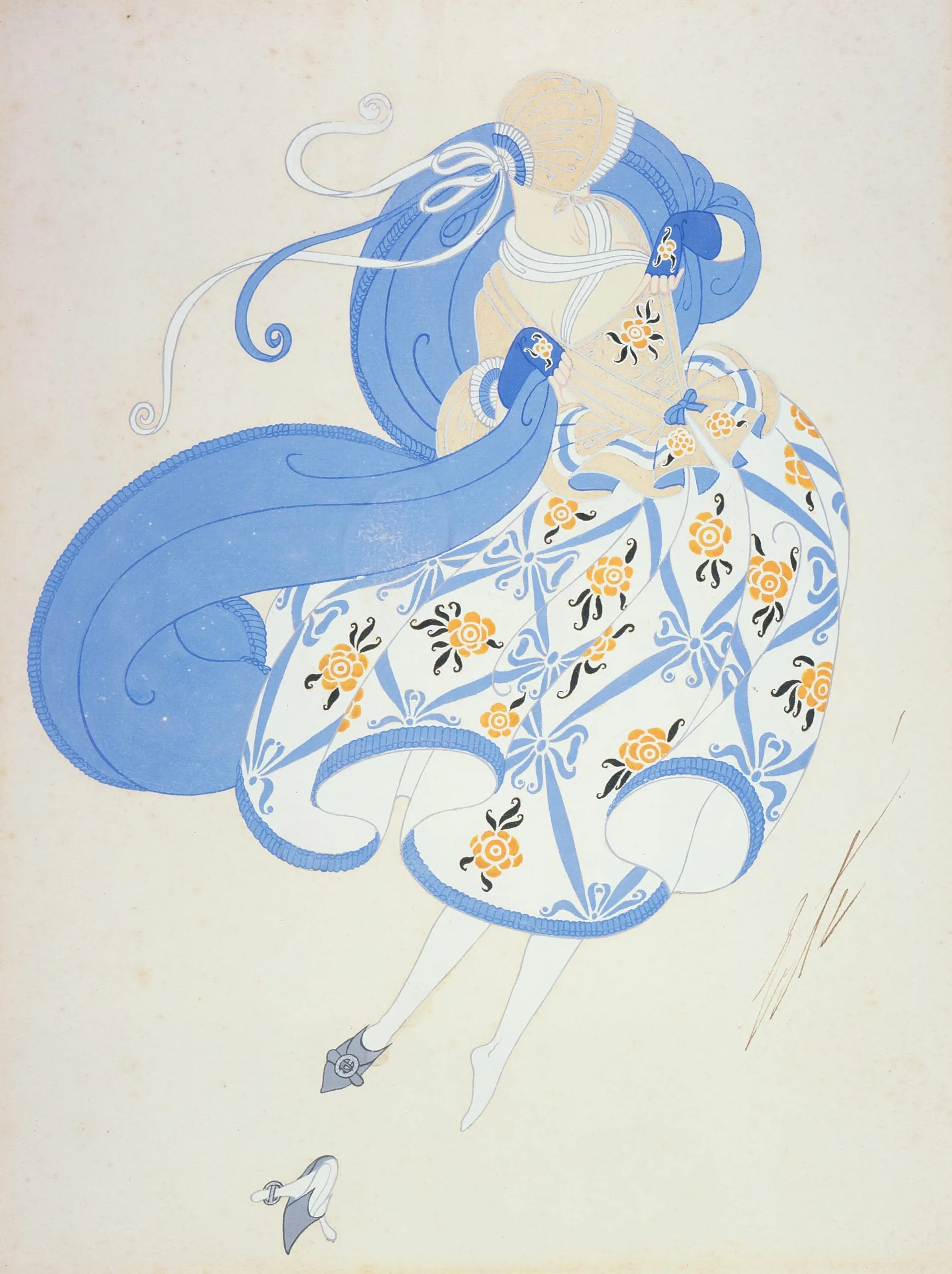 Gouache and ink drawing of a female figure in a vast white-and-blue latticed skirt with orange floral motifs, blue ribbons, and long cascading blue hair, shown from behind mid-movement