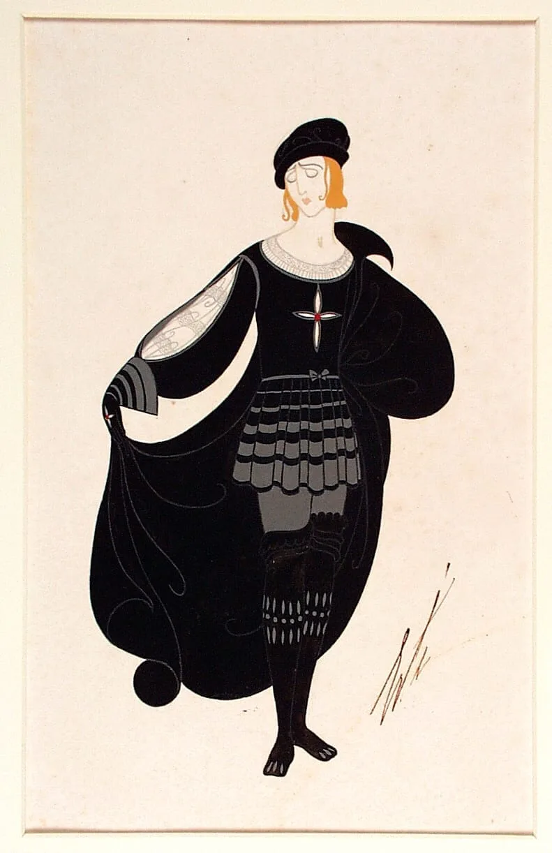 Fashion illustration in black ink and gouache showing a stylized full-length female figure in a black cape, tiered skirt, and beret, rendered in a flat Art Deco graphic style