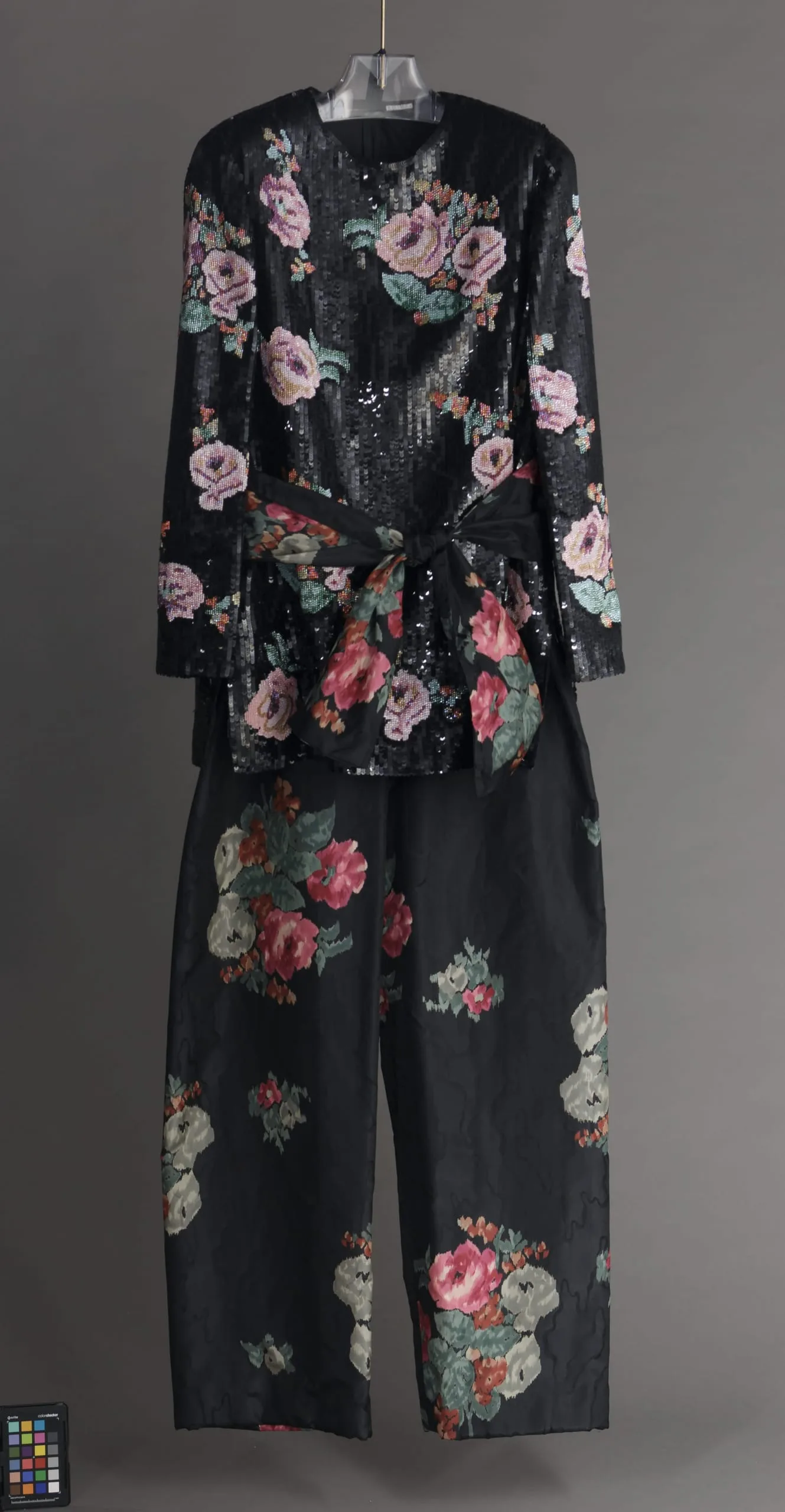 - Tunic: plastic sequins and glass bead embroidery. Pants and Sash: figured silk plain weave