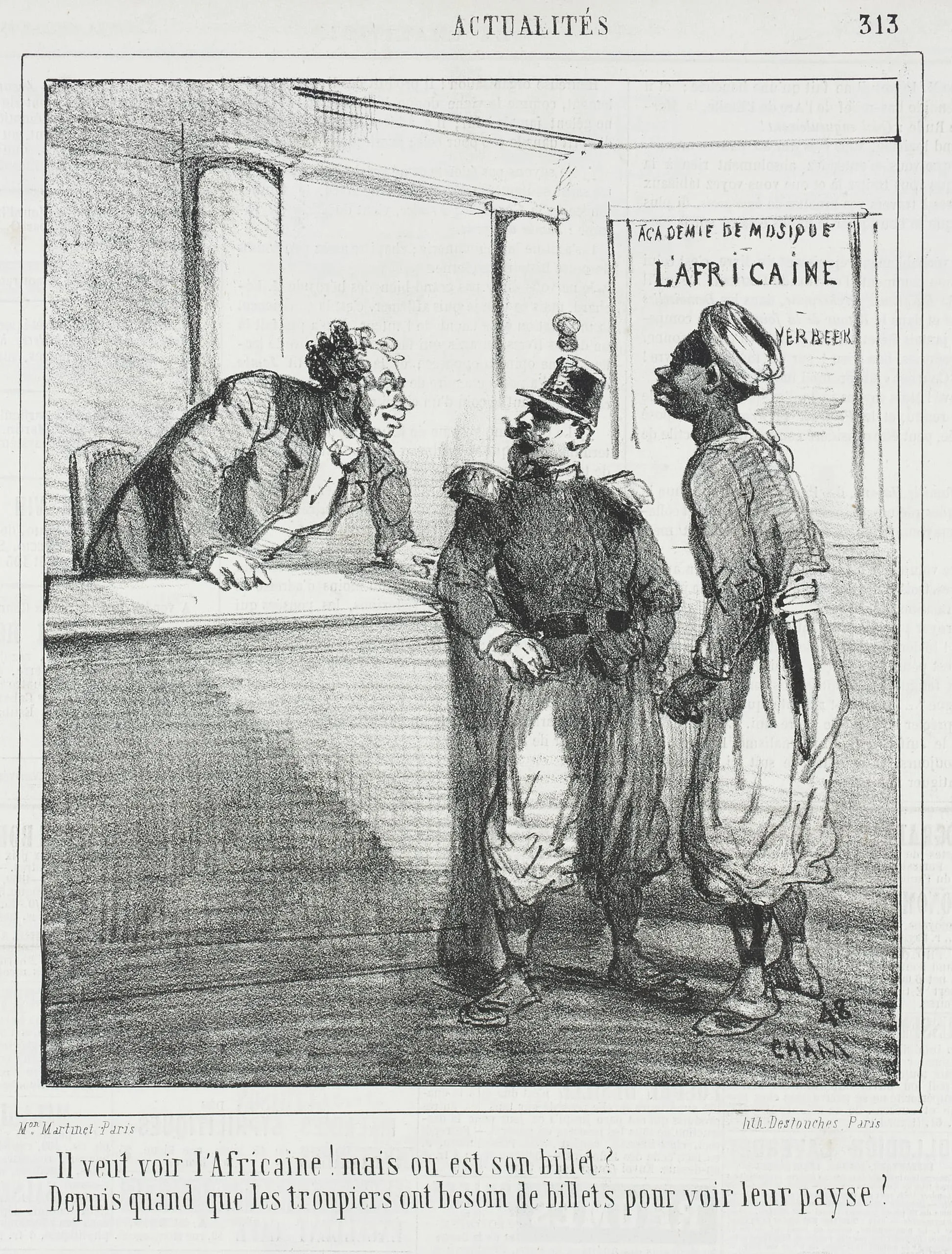 - Il veut voir l'Africaine! mais ou est son billet? -Depuis quand que les troupiers ont besoin de billets pour voir leur payse? (Academie de music presente l'Africaine)