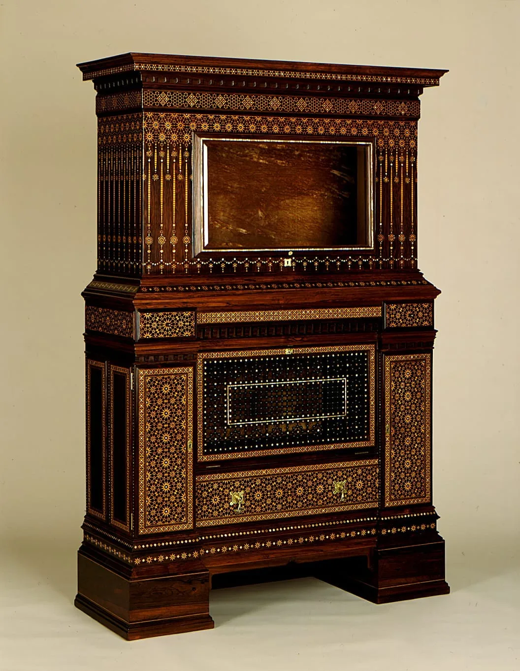 From the 1870s onward prestigious Victorian upper-class homes might have included elements of Near Eastern design, such as Persian-style "cozy corners" and smoking rooms. This lavishly inlaid cabinet would certainly have suited such an exotic environment.