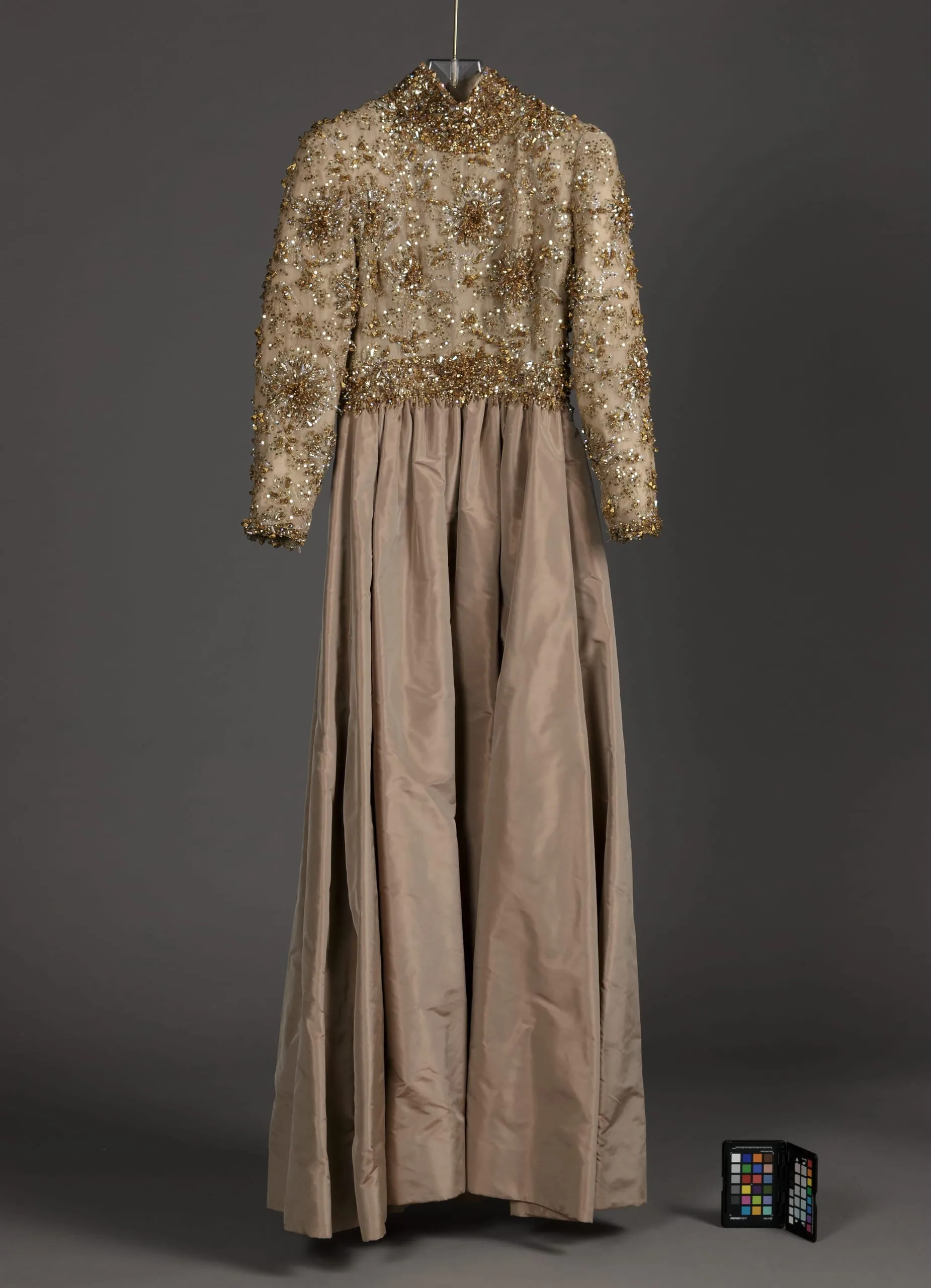 - Silk plain weave and silk and metallic-thread lace with metal sequins, metal beads, glass beads, crystals, and plastic embroidery