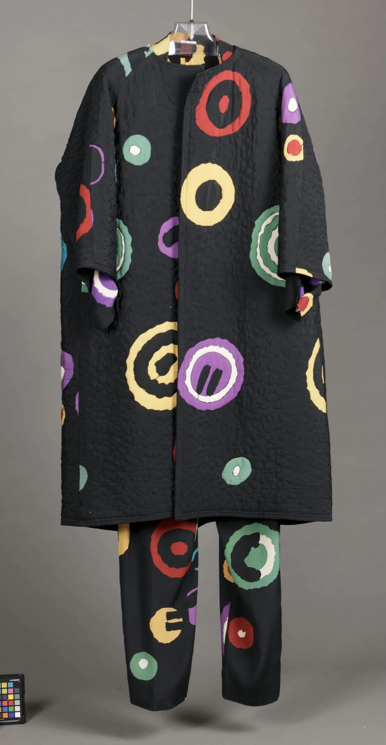 - Coat: Silk plain weave, printed and quilted; Blouse and Pants: silk plain weave, printed