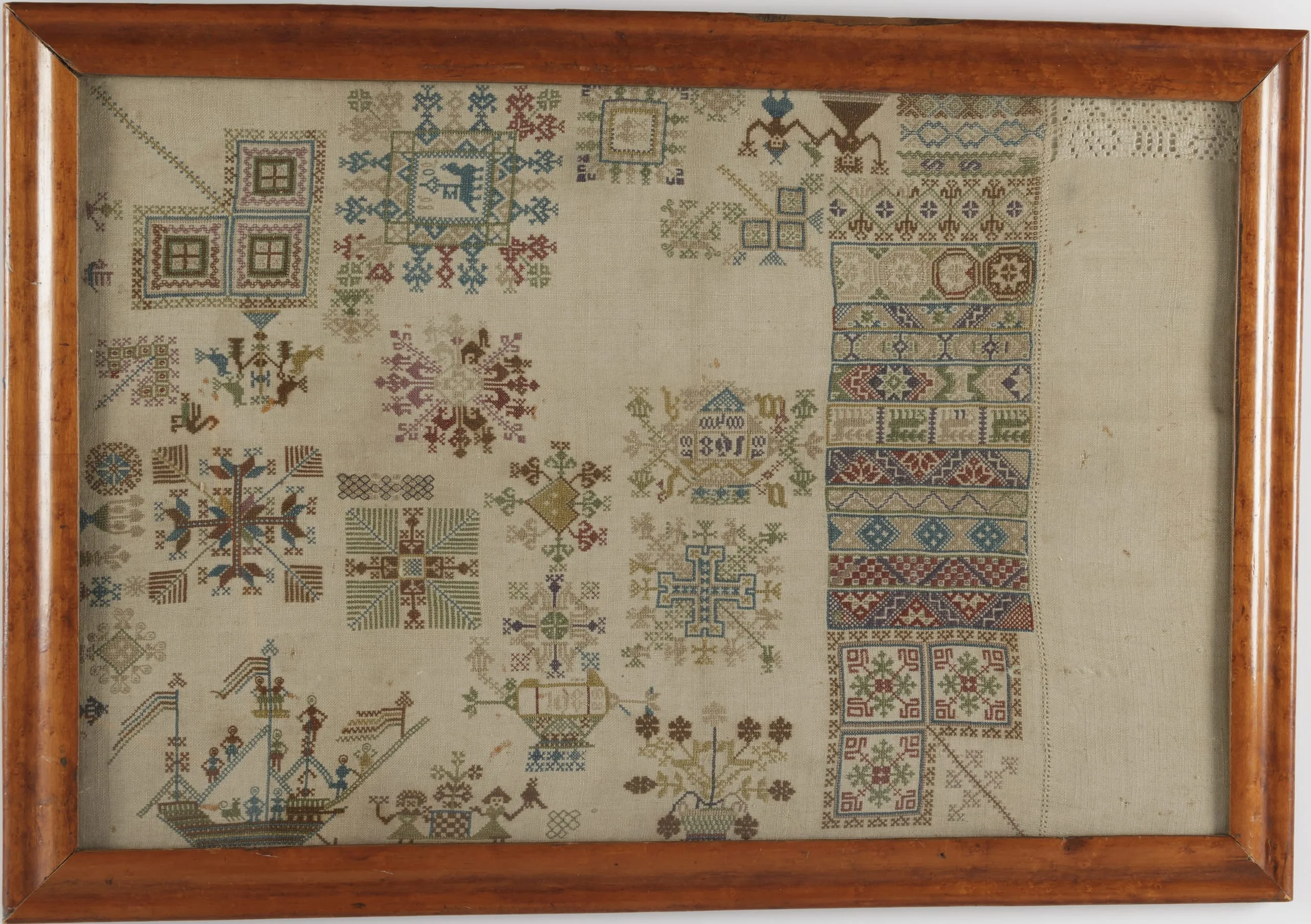 Framed cross-stitch needlework sampler on ivory linen, densely filled with geometric motifs, pattern bands, a sailing ship, and stylized figures in blue, red, olive, and brown thread