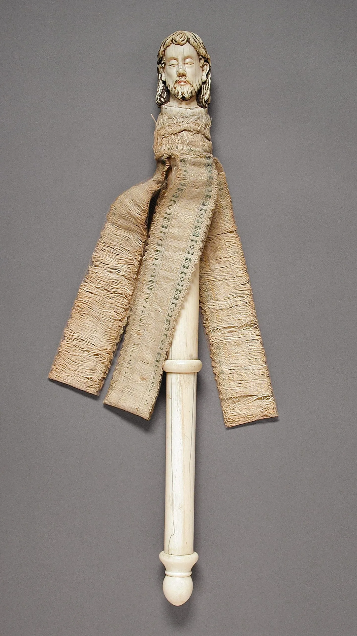 This festooned ivory standard is adorned with the Head of Christ. His eyes are half-shut as if in prayer or meditation, which may reflect an iconographic assimilation of divine physical features from earlier artistic depictions of the Buddha or a Jina. An additional noteworthy facial feature is the pronounced forelock, a frequent stylistic trait of South and Southeast Asian images of Christ and several Christian saints.