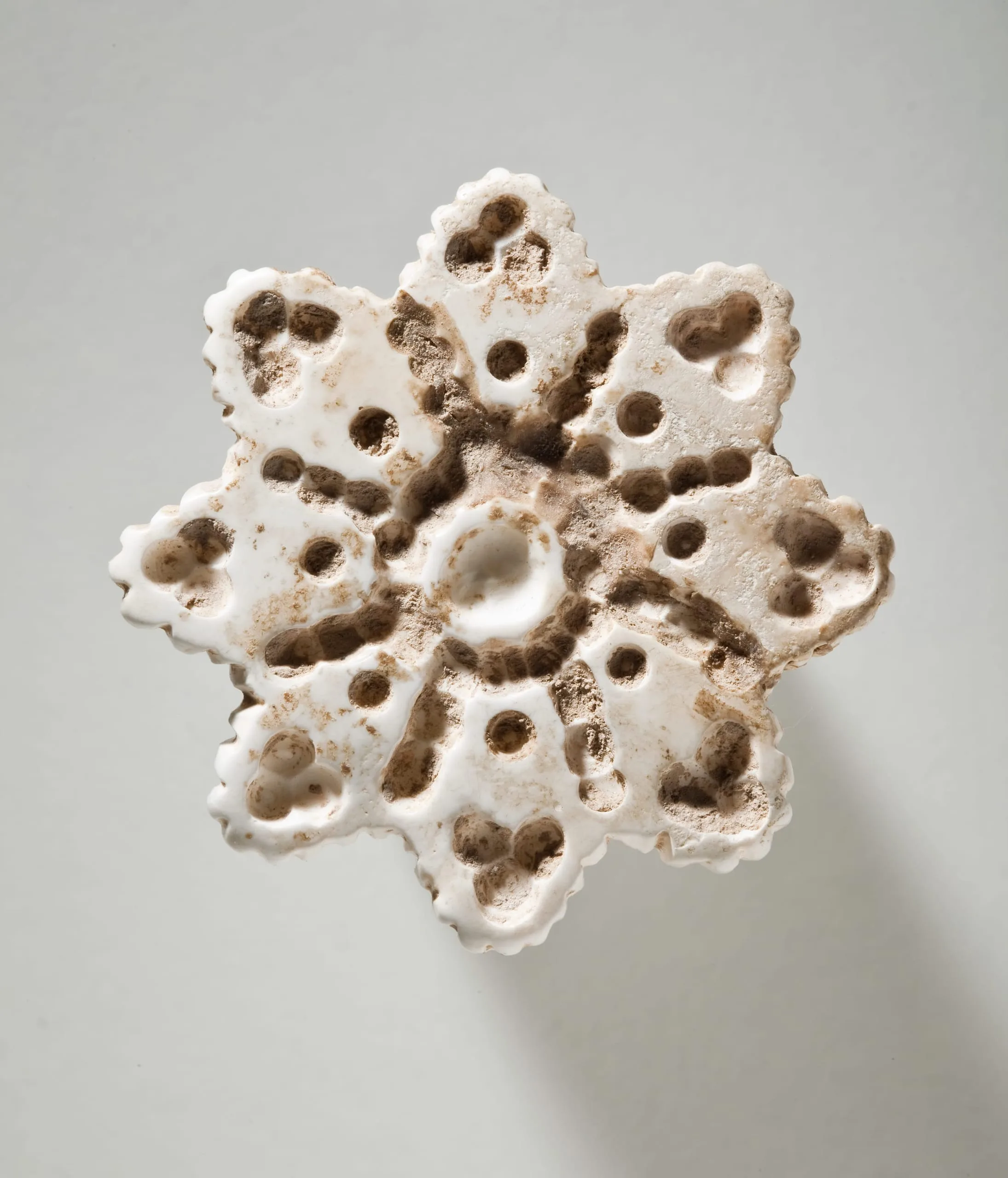 Ceramic star-shaped decorative object with six scalloped lobes, white glaze over sandy brown clay body, pierced with circular holes of varying sizes