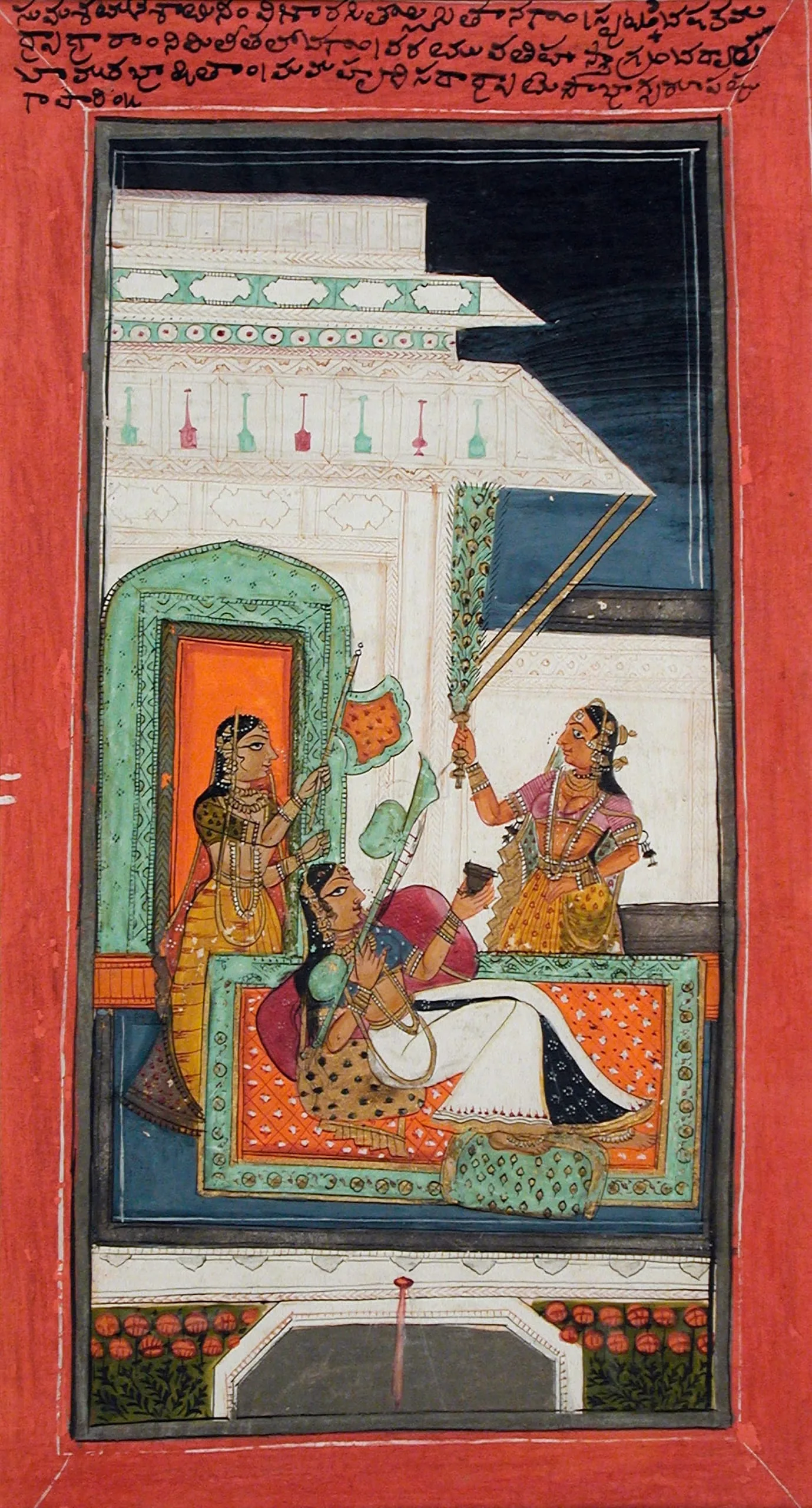 The Sanskrit inscription in Telegu script in the upper red border reads, “In my heart I am always thinking of [?], who reclines on a bed of flowers, has a shining face with eyes closed, enjoys playing the vina and holding a crystal pitcher in her hand is in conversation with two young women who hold fly whisks in their hands. [She] is a figure of beauty.” (Translation by Professor P. Aithal and Dr. H. Metzger.) The illustration generally accords with the inscribed description, except that the personified goddess holds what appears to be a metal cup or goblet rather than a crystal pitcher. Moreover, only one of the female attendants holds an honorific fly whisk, which is represented here as a peacock feather fly whisk (morchal) rather than a fly whisk made from the white tail-hairs of a yak (cauri or chowri). The other attendant holds a fan.