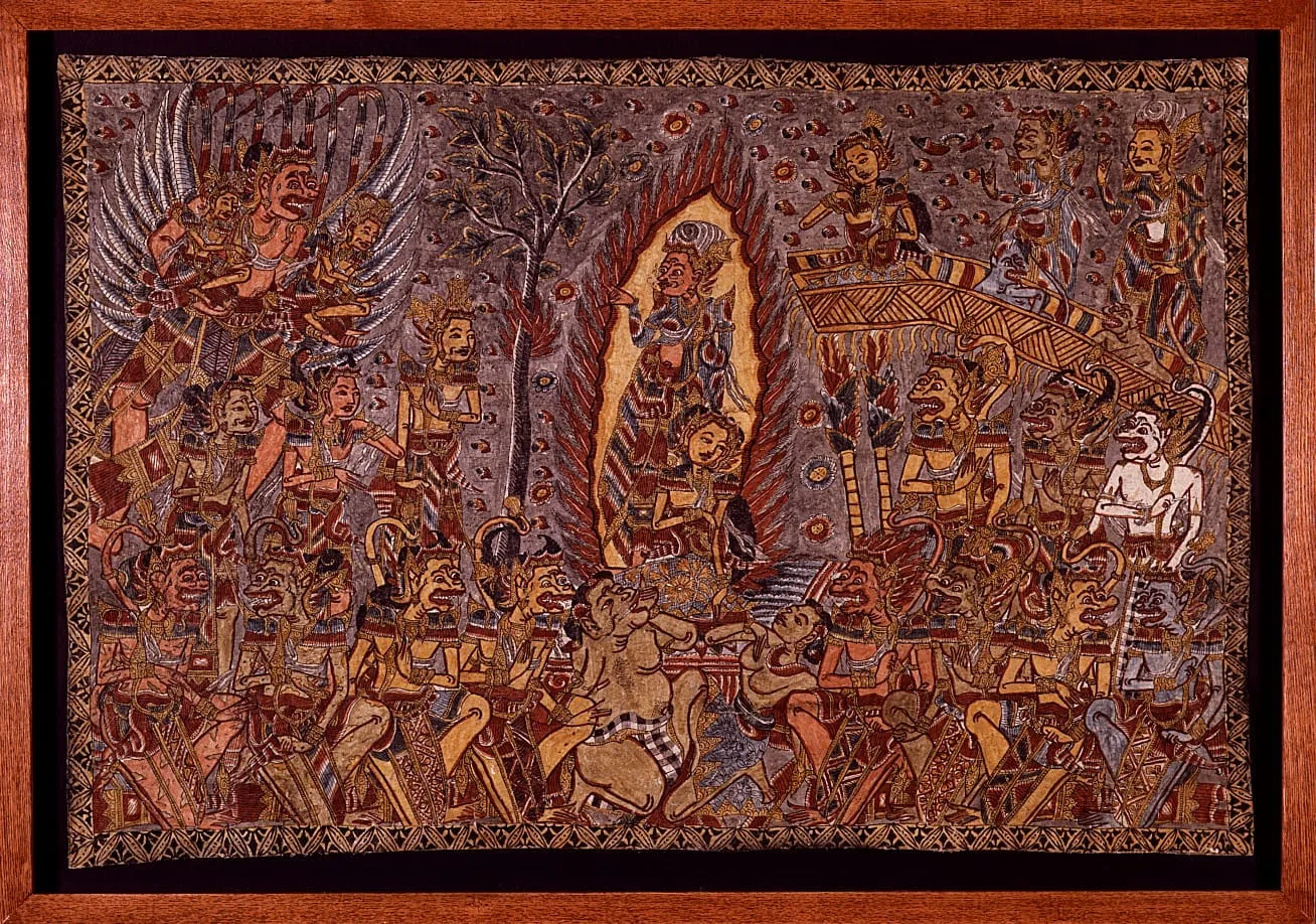 This painting depicts an episode in the great Indian epic, the Ramayana, in which Princess Sita undergoes a trial by fire to prove her fidelity to her husband, Rama, during her captivity by the Demon King Ravana. Sita is shown unharmed in the center of the flames, accompanied by Agni, the Hindu god of fire, who protects her because she remained virtuous. The gods, Sita’s friends and relatives, her husband and his vast army are arranged hierarchically around the funeral pyre. To the right, on the ramp from which Sita leapt into the pyre, is Trijata, her companion during her long captivity. Below the ramp are the monkey generals Sugriva, Angada, and Hanuman. To the left are Rama, Lakshmana, and Vibhisana, Trijata’s father. In the upper left corner, the gods Shiva, identified by his third eye of wisdom, and Indra, the king of the gods, are carried by a flying servant of the defeated Ravana. Monkeys, bears, and other creatures in the service of Rama stand below the fire.