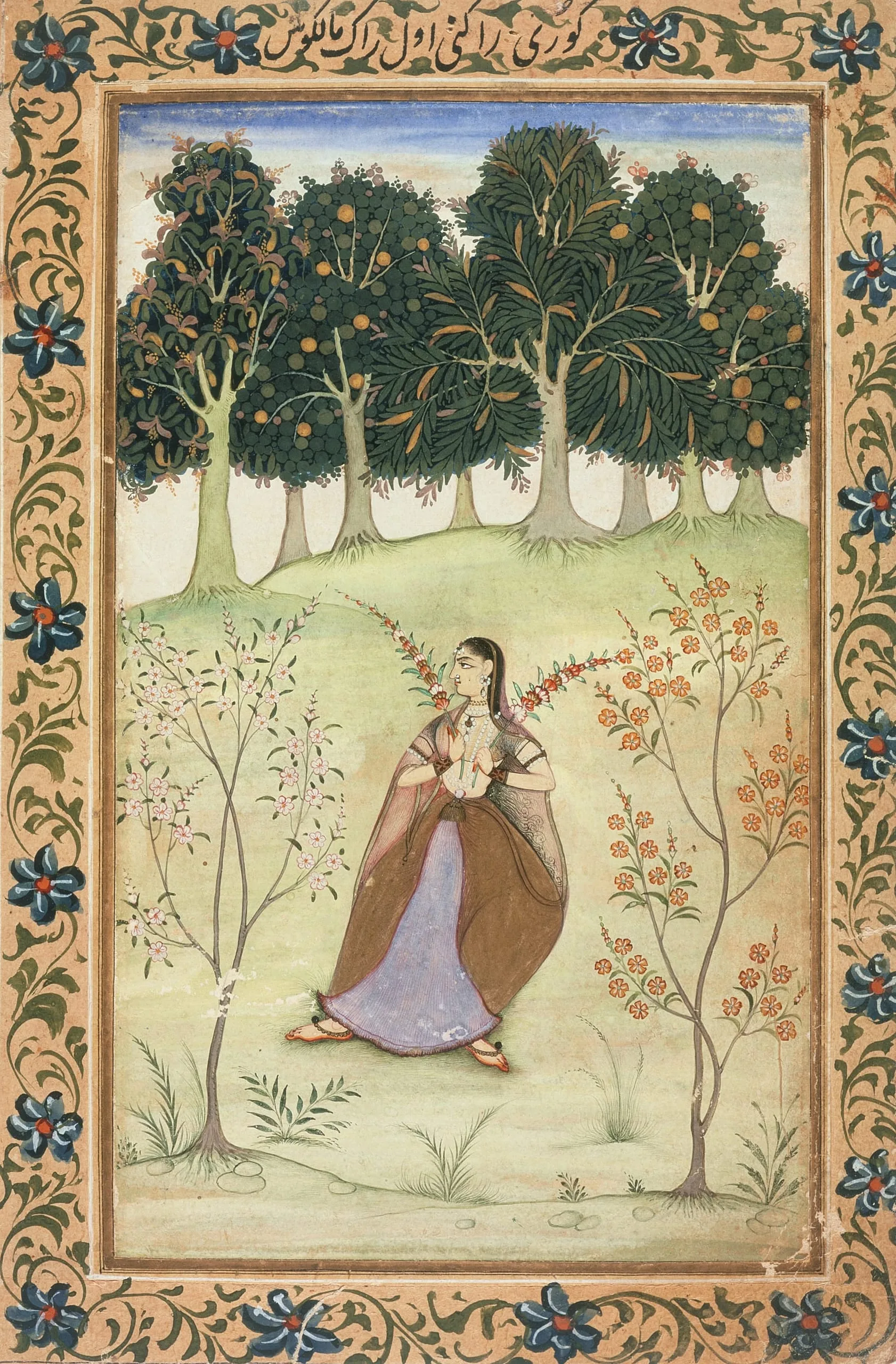 Two short Persian inscriptions in the upper border amidst the flowering vine and on the reverse identify the subject as Gauri Ragini, the first wife of Malkos Raga, and provide the time when it should be sung.