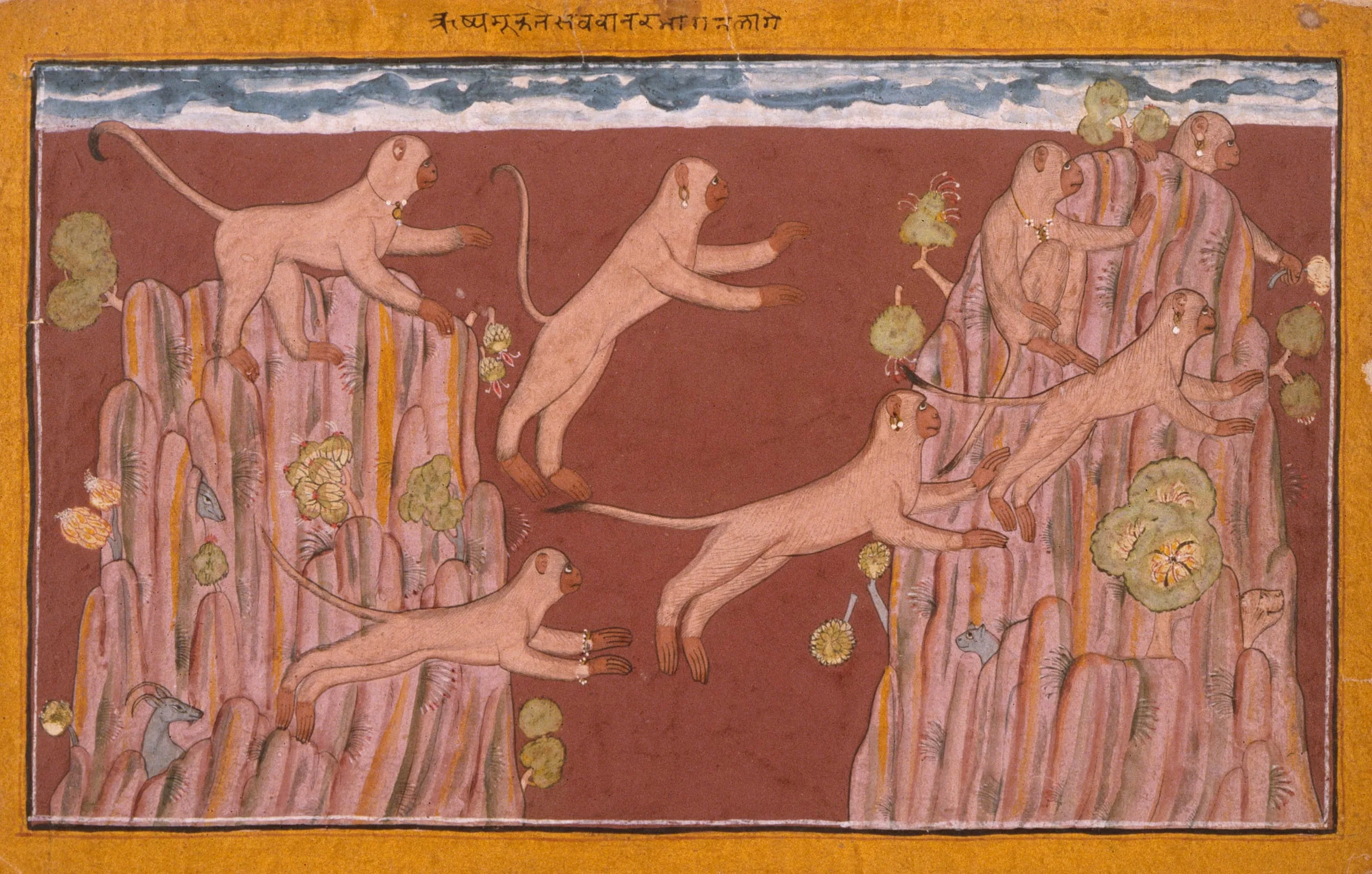The Hindi inscription added later in the header states, "All the monkeys rush towards Mount Rishyamuka." (Translation by Stephen Markel.)