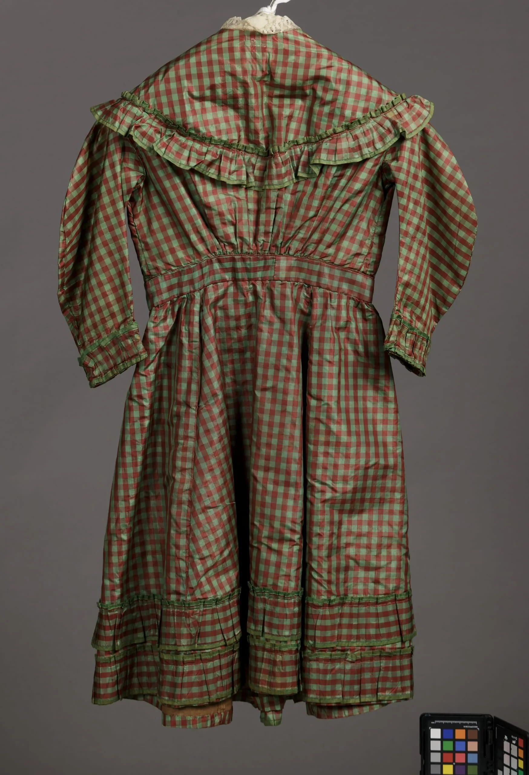 Child's mid-19th-century dress in rose-red and sage-green checked fabric, shown from the back, with ruffled collar, tiered hem, and solid green trim accents