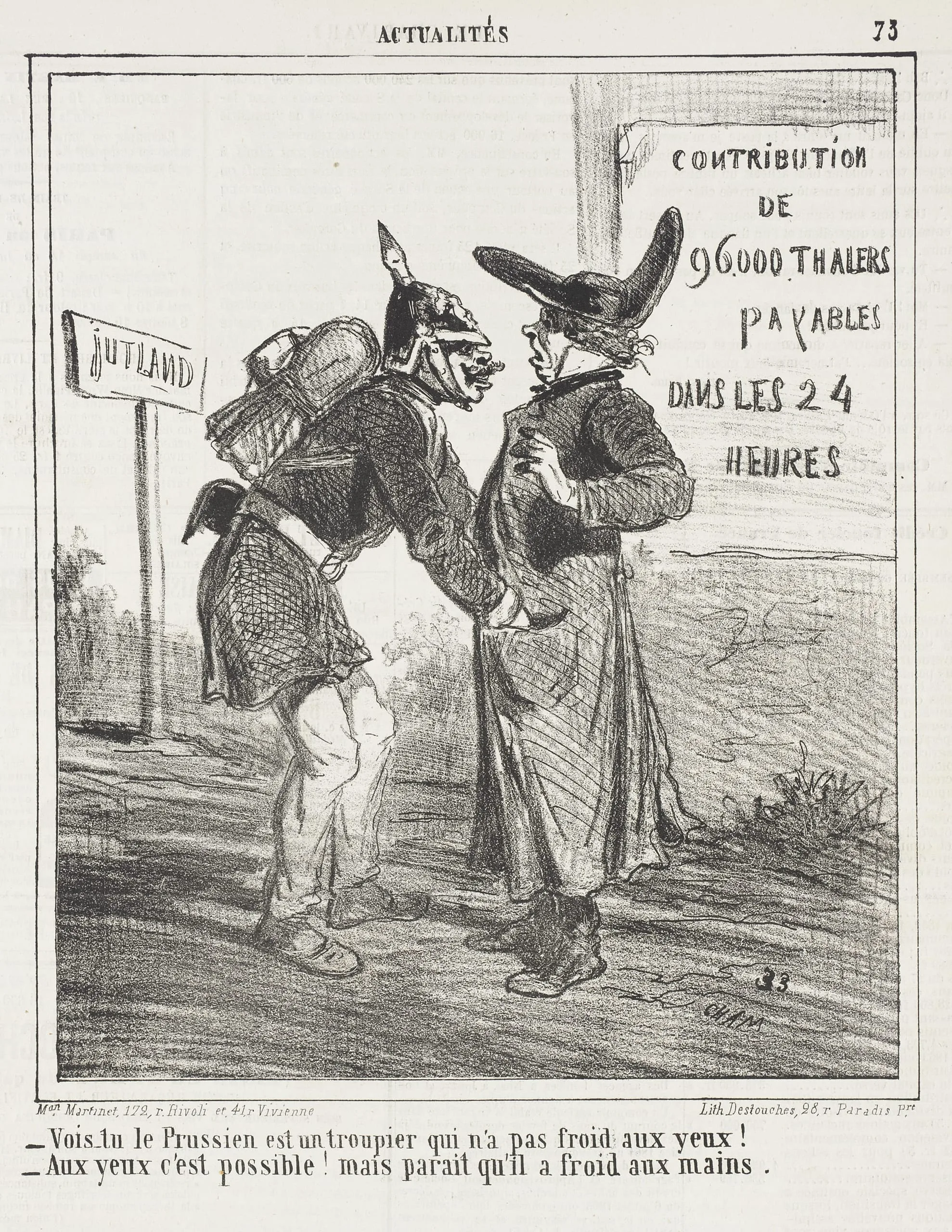 - Vois-tu le Prussien est un troupier qui n'a pas froid aux yeux! . . . Aux yeux c'est possible! Mais parait qu'il à froid aux mains. (Contribution de 96.000 Thalers payable dans les 24 heures)