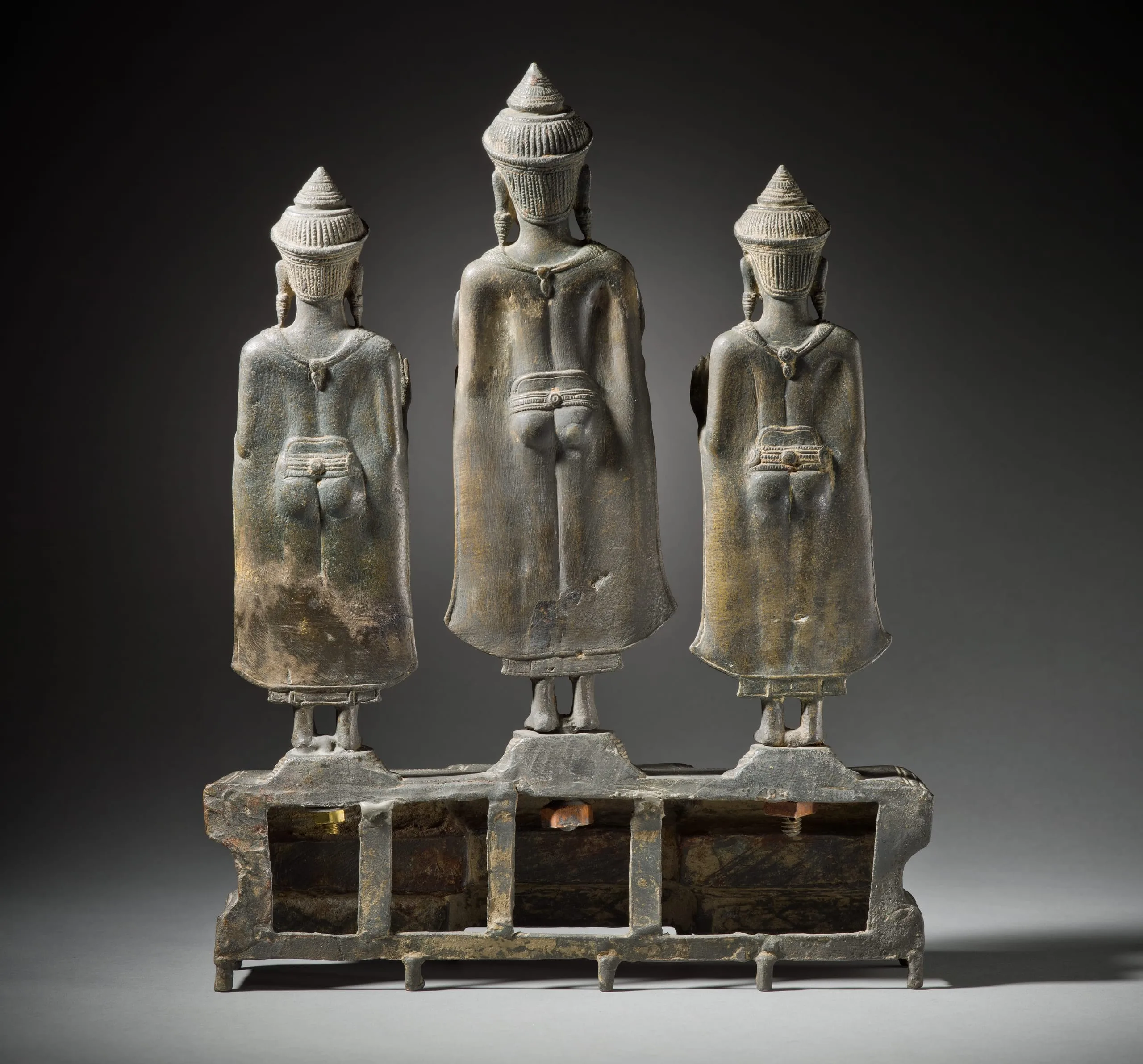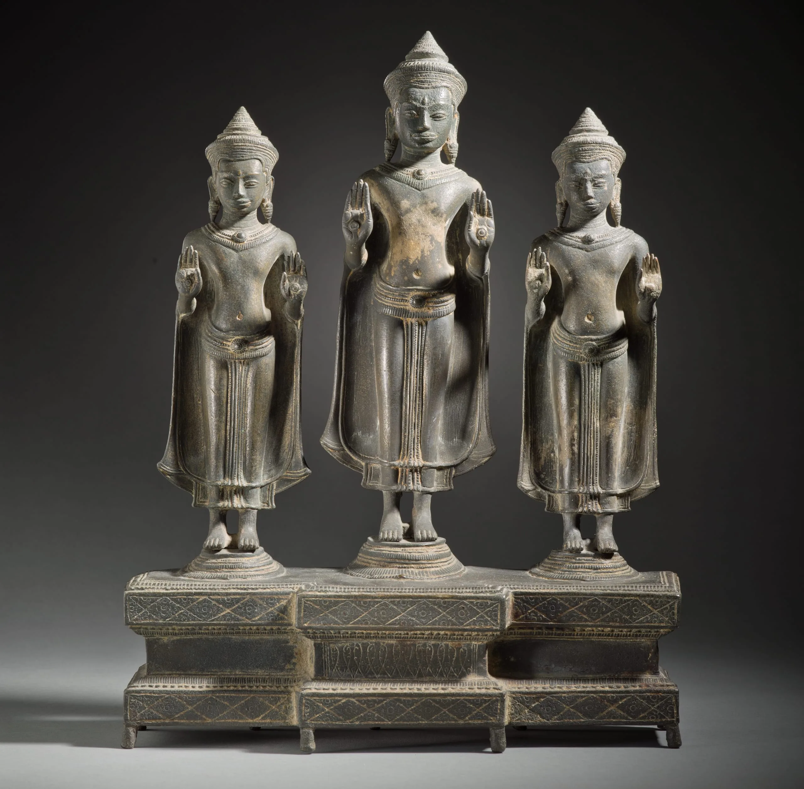 Buddhist triads often depict the historical Buddha Shakyamuni (traditionally dated to 563–483 BCE) flanked by the bodhisattvas Avalokiteshvara and Maitreya. The latter two are distinguished iconographically by their crown insignias, the Amitabha Buddha and a stupa (funerary monument) respectively. Here, however, the three virtually identical Buddhas (the central one is slightly larger) may represent the historical Buddha Shakyamuni (traditionally dated to 563–483 BCE) flanked by Dipankara Buddha, the Buddha of the Past, and Maitreya, the Buddha of the Future.