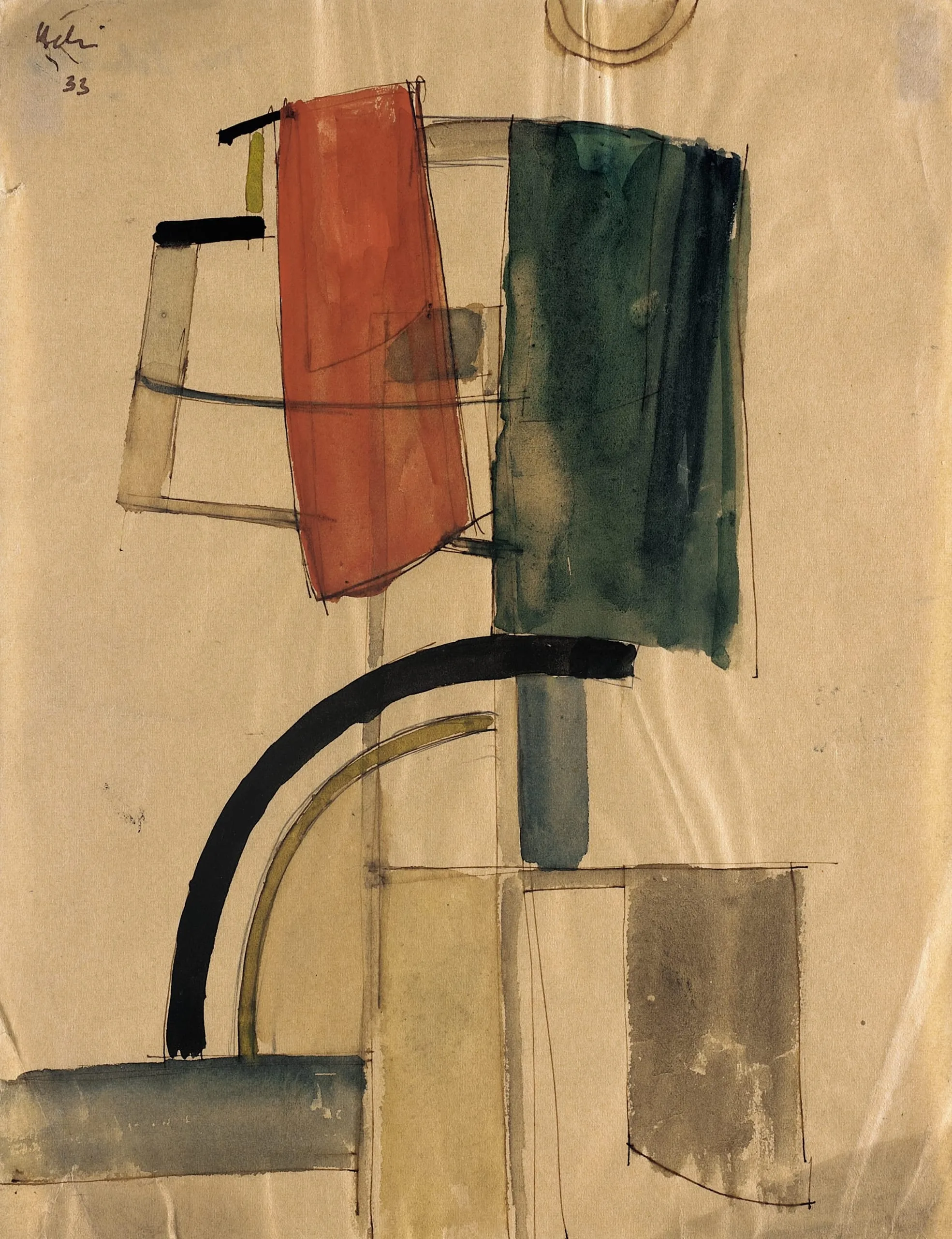 - Brush with watercolor and black and brown ink wash over pen and brown ink and pencil