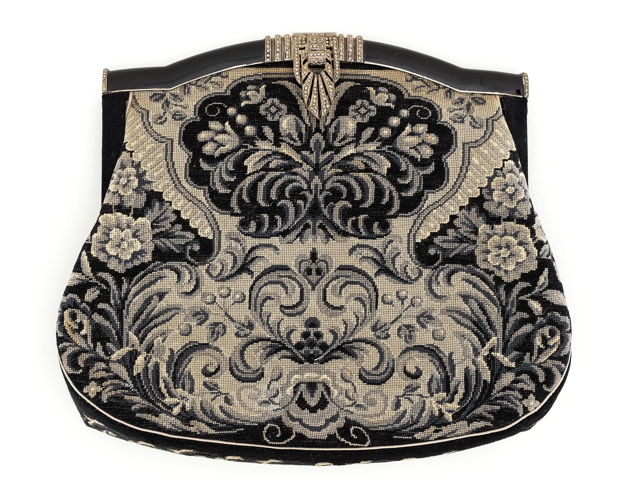 - Silk embroidery, sterling silver, marcasite, moire silk