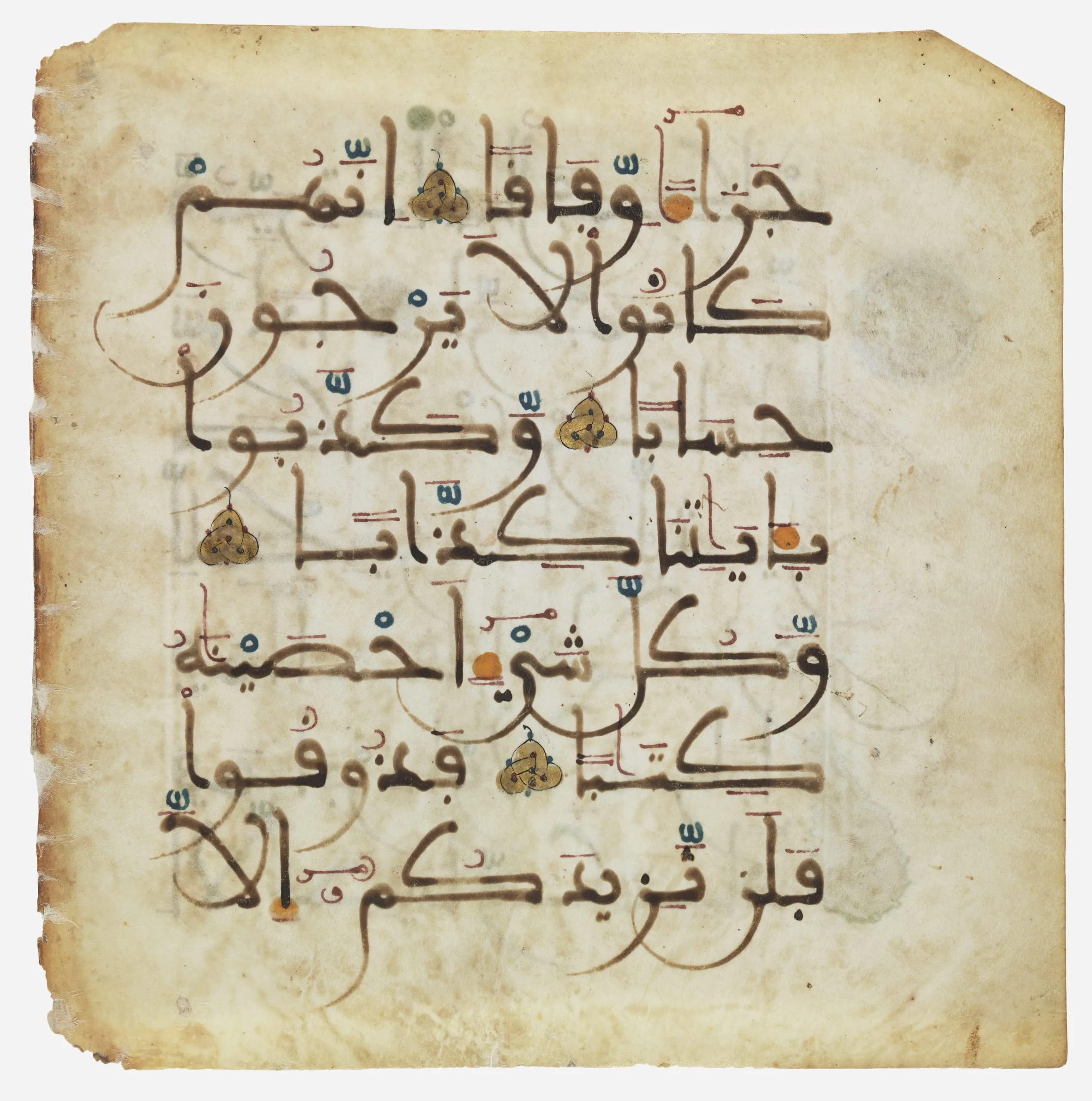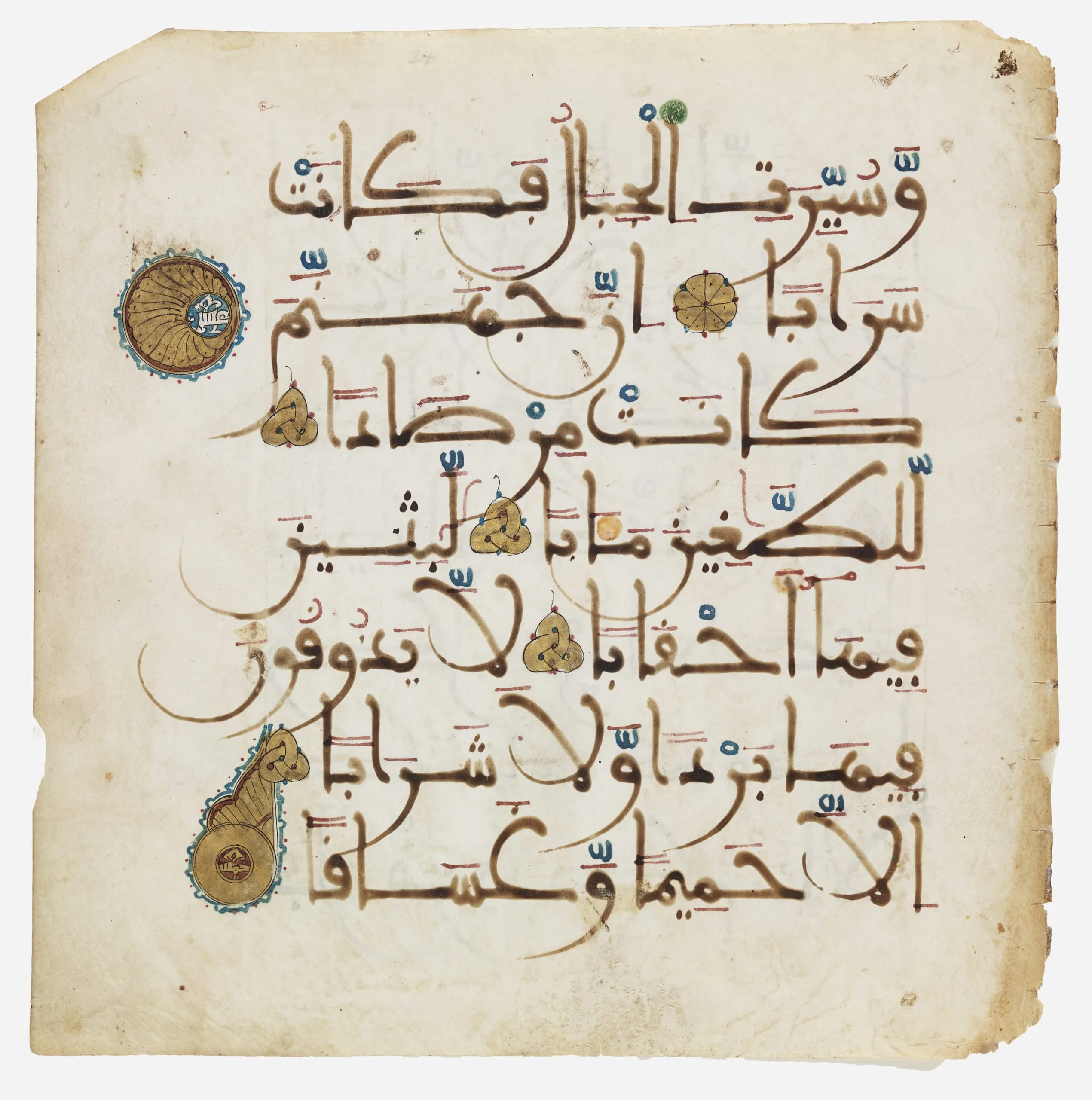 This page from a manuscript of the Qur’an is typical of al-Andalus (Islamic Spain) on account of its use of parchment, which remained in favor in the region for copying the sacred text even after it had been supplanted by paper elsewhere in the Islamic world, and because of its distinctive script, known as Maghribi. It has seven lines per page finely written in brown ink, while the vocalization and other reading marks are rendered in yellow, red, blue, and green. The single verse markers take the form of golden knots; every fifth and tenth verse is indicated by a stylized palmette and by a medallion illuminated in gold.