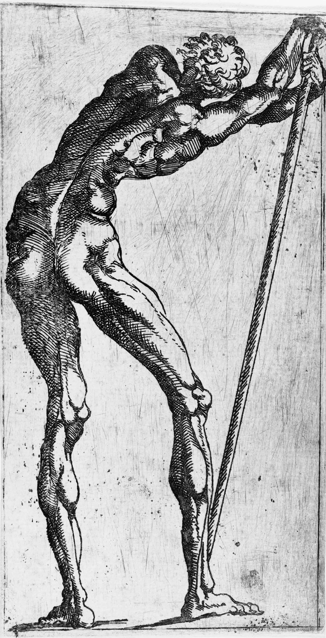 - Back of Figure, Leaning Toward Right on a Large Stick