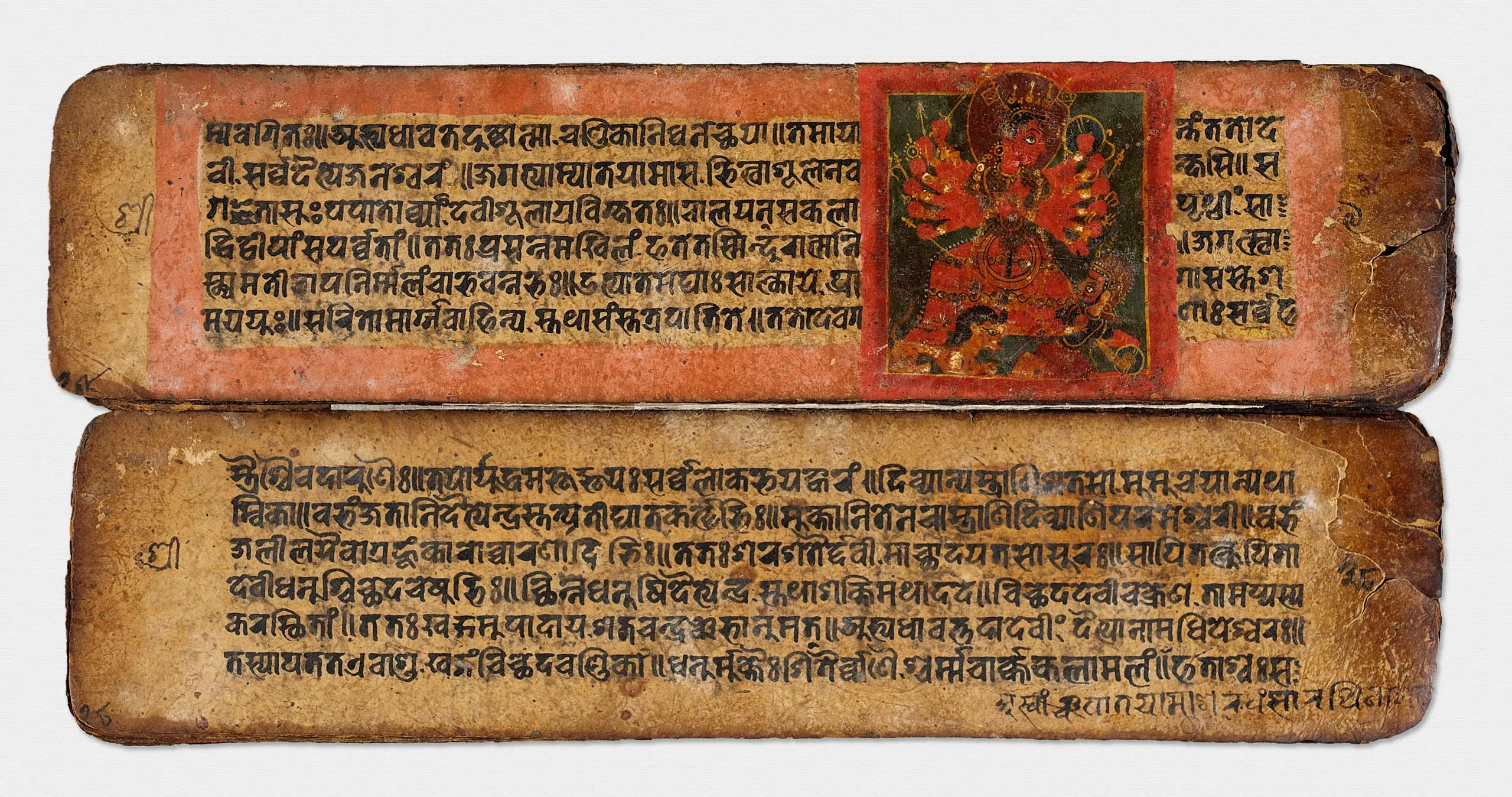 - Opaque watercolor and ink on paper; wood cover with colored unguents
