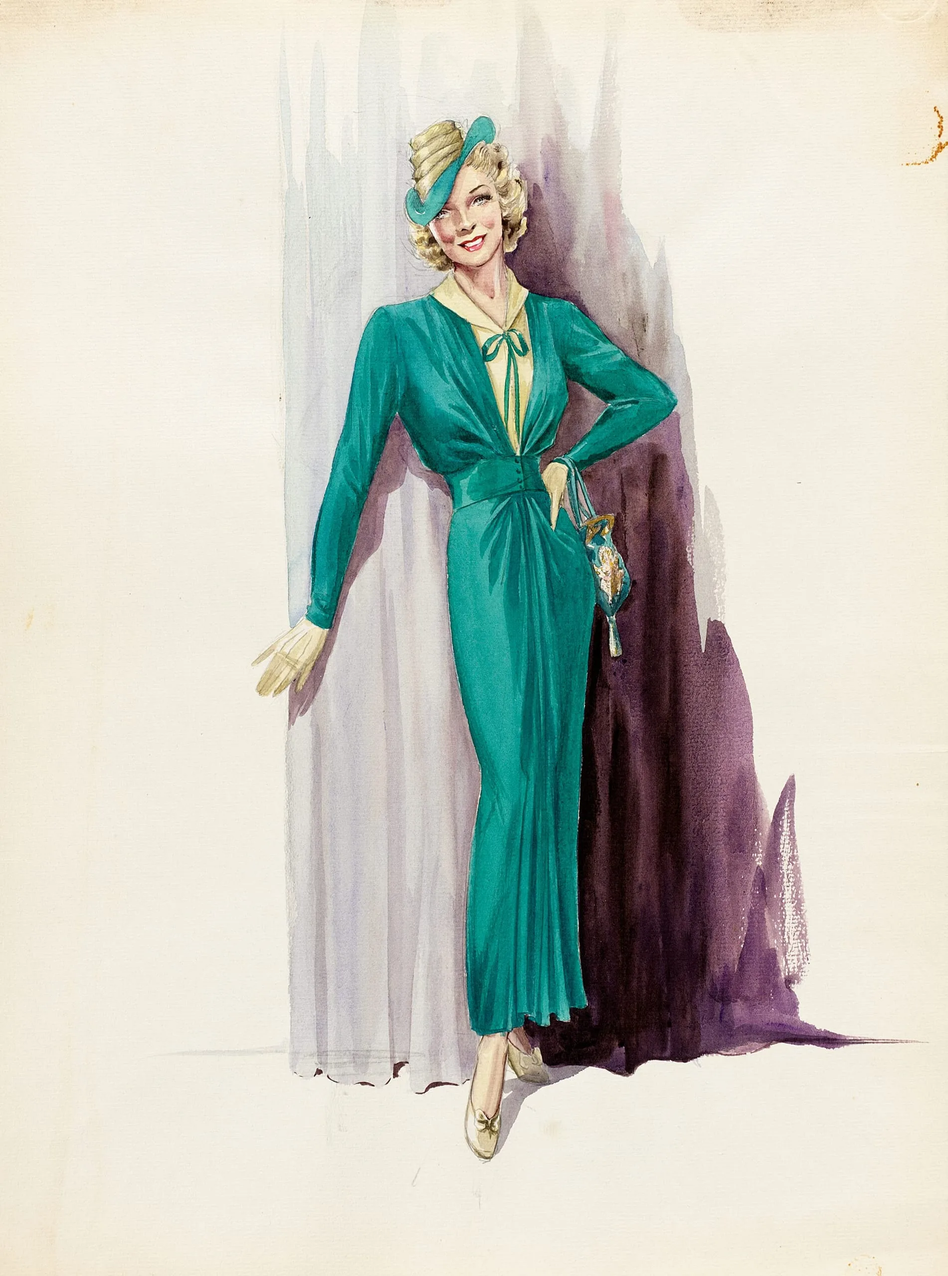 Watercolor and gouache full-length fashion illustration of a woman in a teal green floor-length dress with V-neckline, cream gloves, and matching teal hat