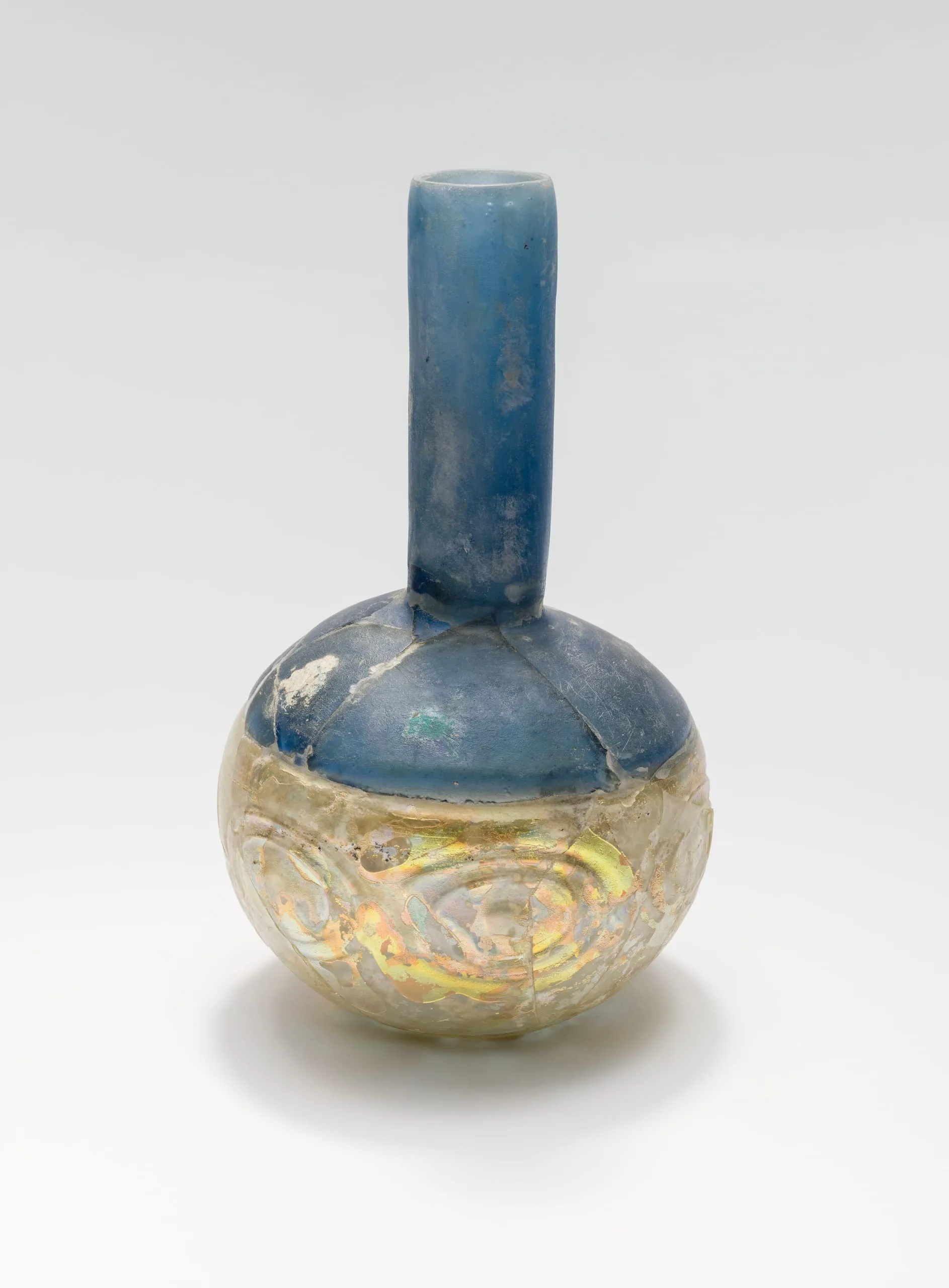 In the decades of the transition from the Late Antique to the early Islamic era, glass production largely continued unabated using the same forms, styles, and techniques. In time, however, craftsmen working under the new faith and leadership pioneered novel methods for decorating and manipulating the malleable and adaptable material. Such is the case with this partially reconstructed long-necked bottle, which required great technical skill because it was made in two parts, joined at the shoulder. The vivid contrast between the cobalt blue neck and colorless glass body is enhanced by pressed designs in the lower section that give texture to the otherwise smooth bottle. Although two glass vessels decorated in this technique carry inscriptions indicating that they were made in Cairo, there is as yet insufficient evidence to suggest that all such glasswares were produced in Egypt.
