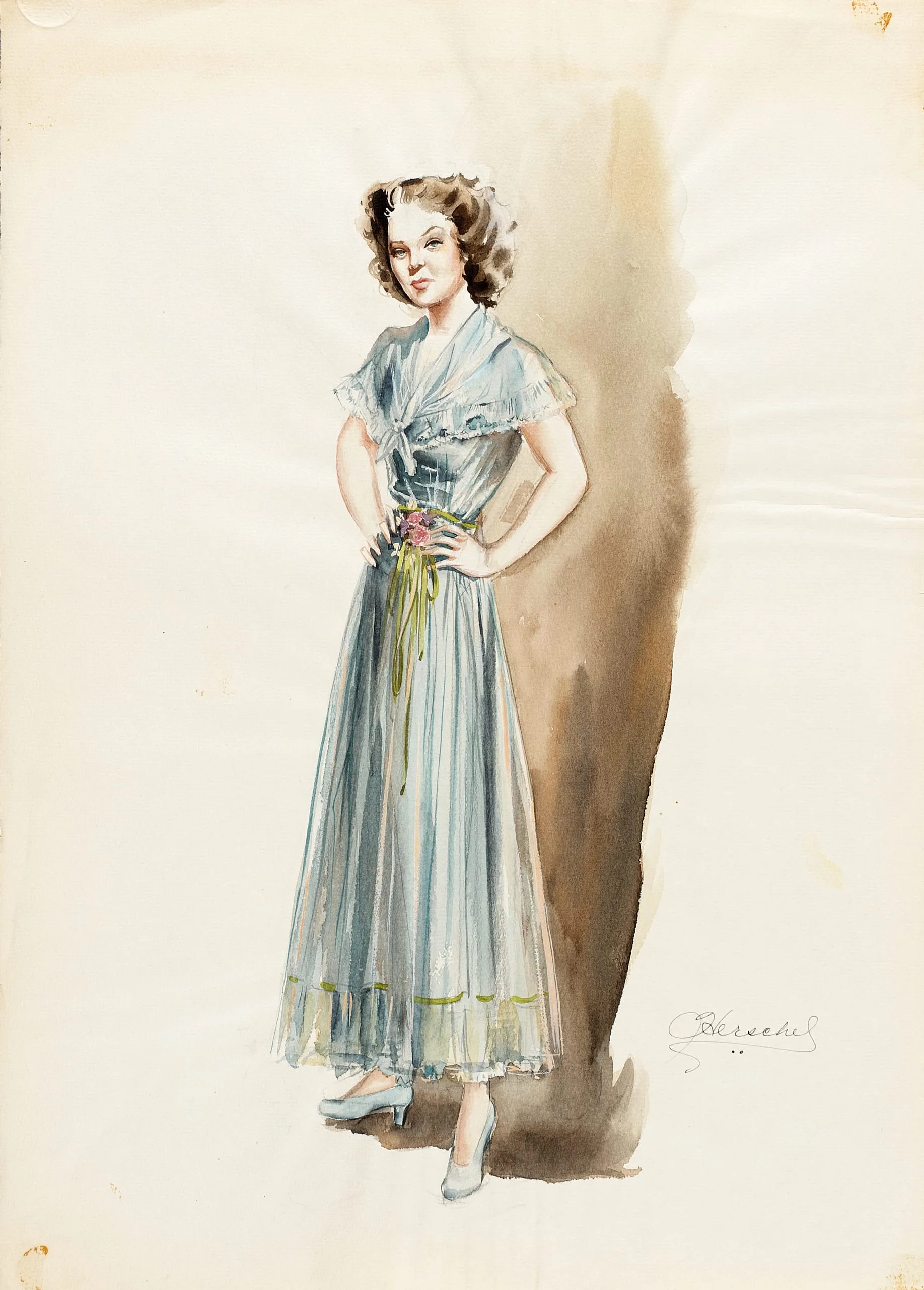 Watercolor and ink costume sketch of a full-length woman in a pale blue, floor-length ruffled dress with olive green trim and sash, standing against a warm brown wash