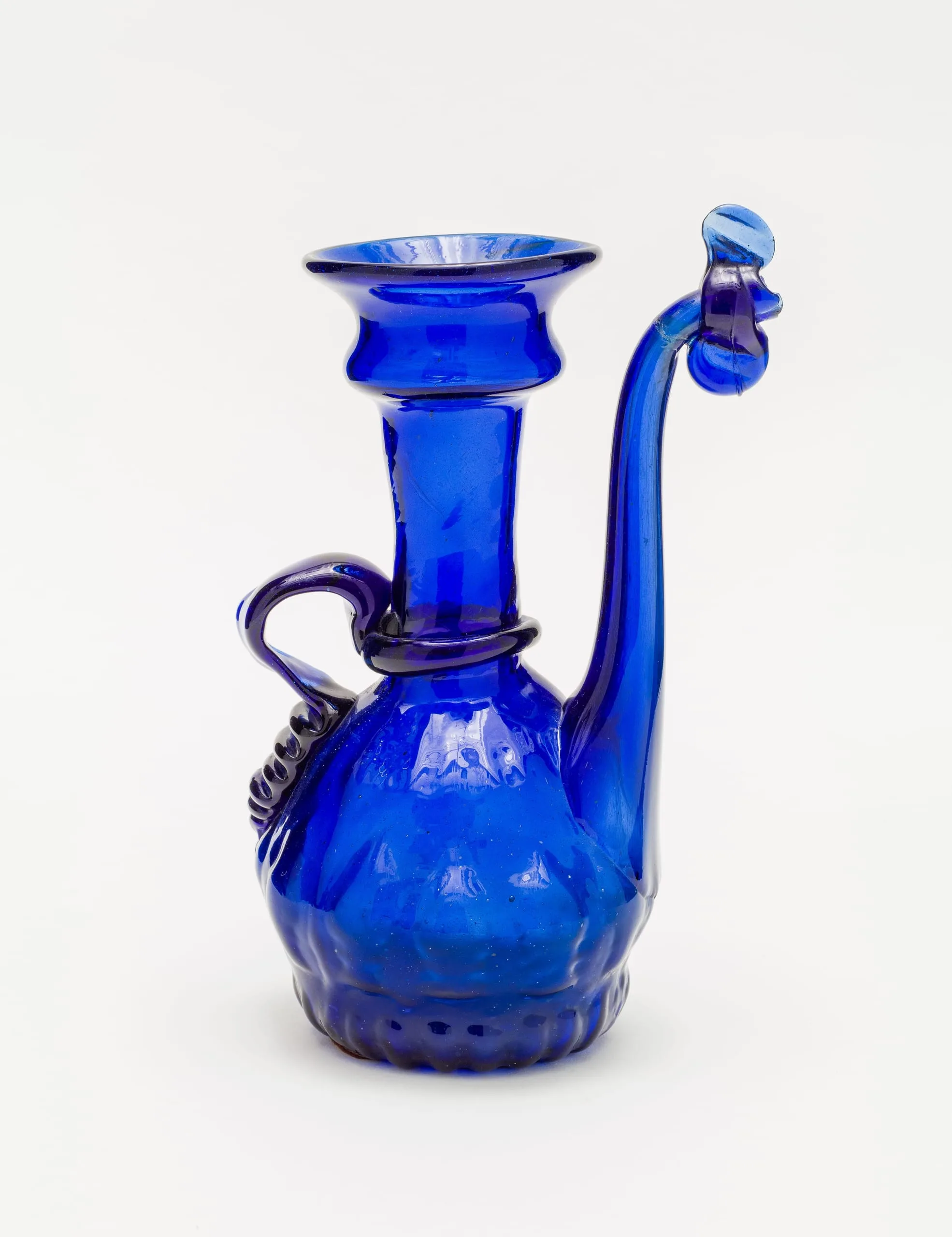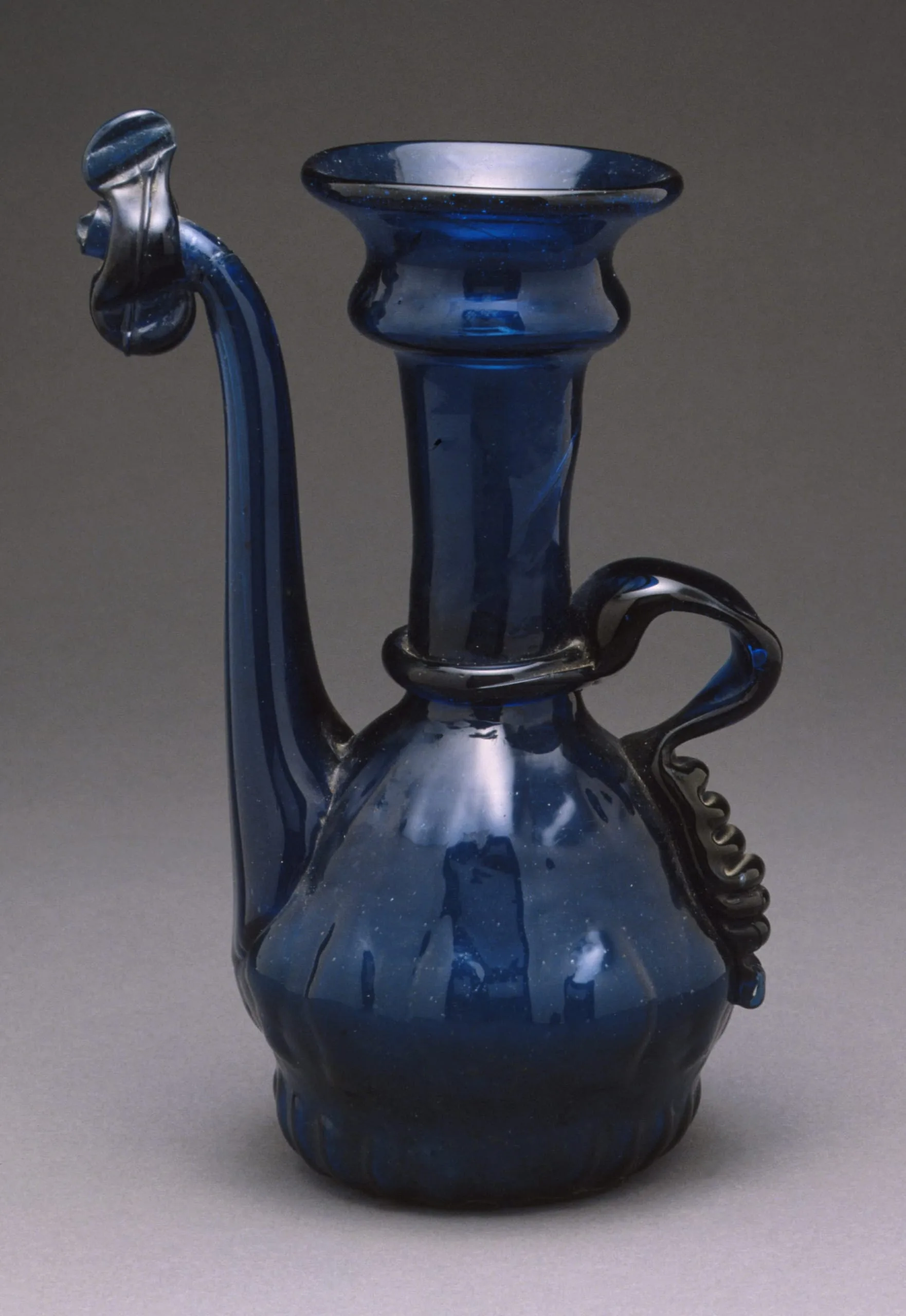 Beginning in the sixteenth century, the traditional direction of glass trade from the Islamic world to Europe reversed as Venice became a major producer of high-quality glass. Yet Middle Eastern glassblowers continued to produce exceptional objects, including richly colored monochromatic vessels from Iran. This deep blue ewer—with its emphasis on an elegant, balanced shape and subtle surface decoration, such as the curving applied glass handle—is typical of nineteenth-century Iranian glass.