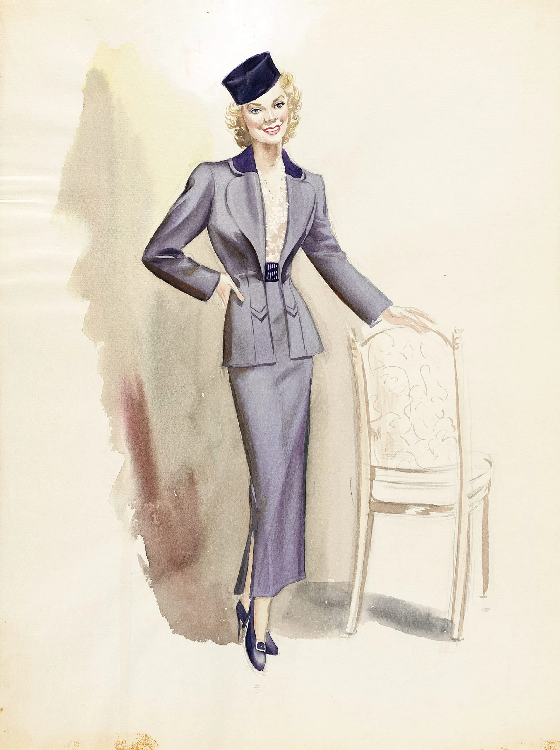 Watercolor and ink fashion illustration, full-length figure of a blonde woman in a slate-blue tailored suit with navy velvet collar and matching pencil skirt, resting one hand on a cream wooden chair