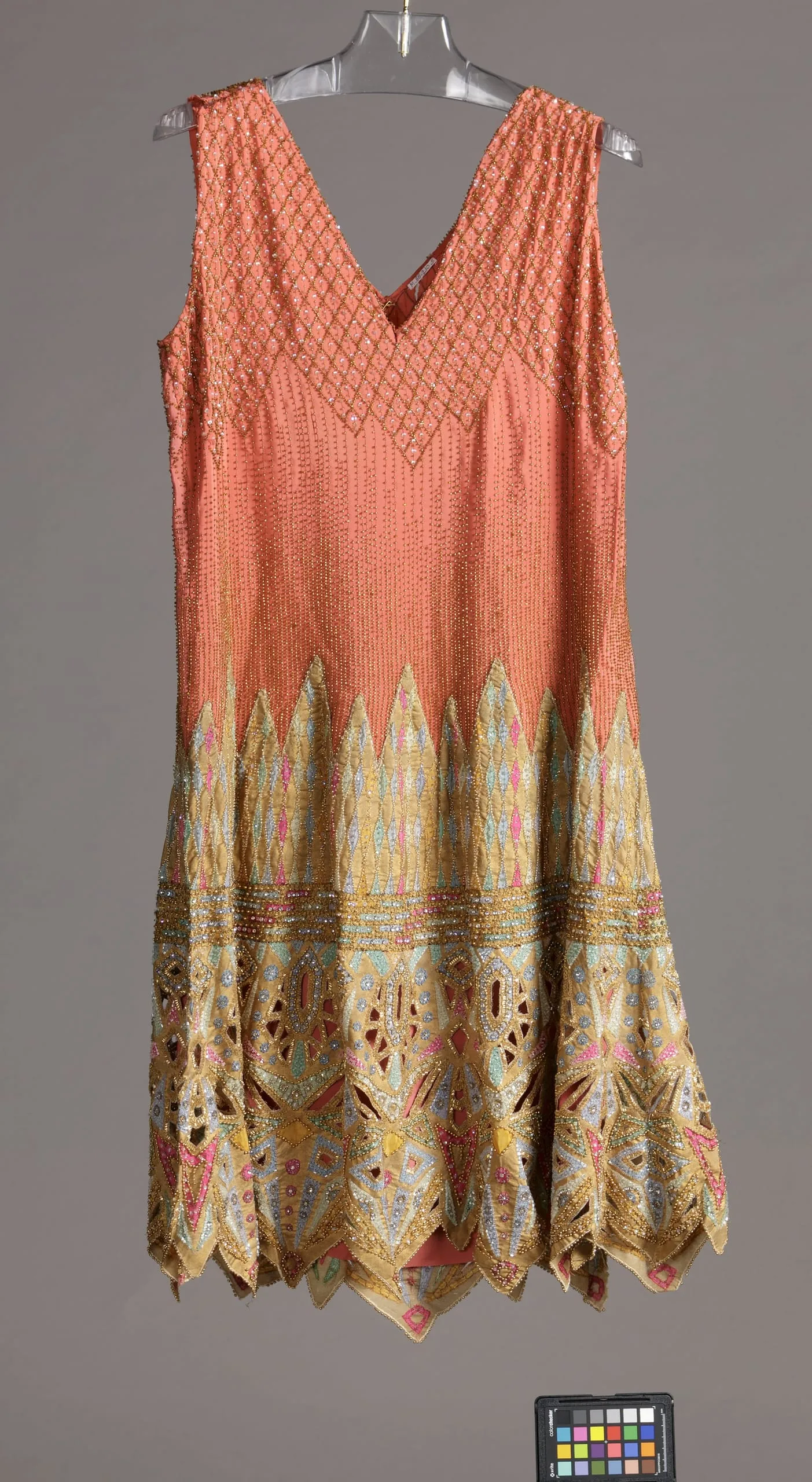 - Silk plain weave (crepe) with cutwork and metallic-thread embroidery, metallic paint, glass beads, celluloid sequins, and crystals