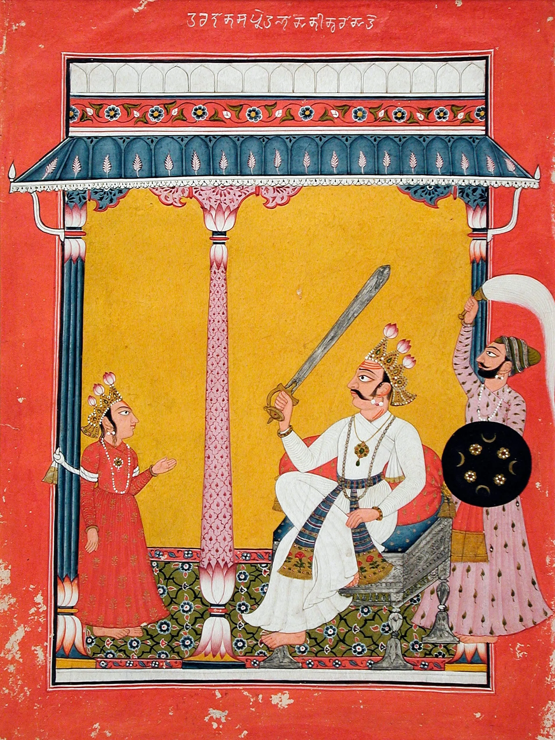 Here, Hiranyakashipu raises his sword to decapitate Prahlada, who is tied to a pillar. An attendant holds the king’s shield and waves an honorific fly whisk made from the white tail-hairs of a yak (cauri or chowri). A caption in white takri script in the upper border identifies the subject.