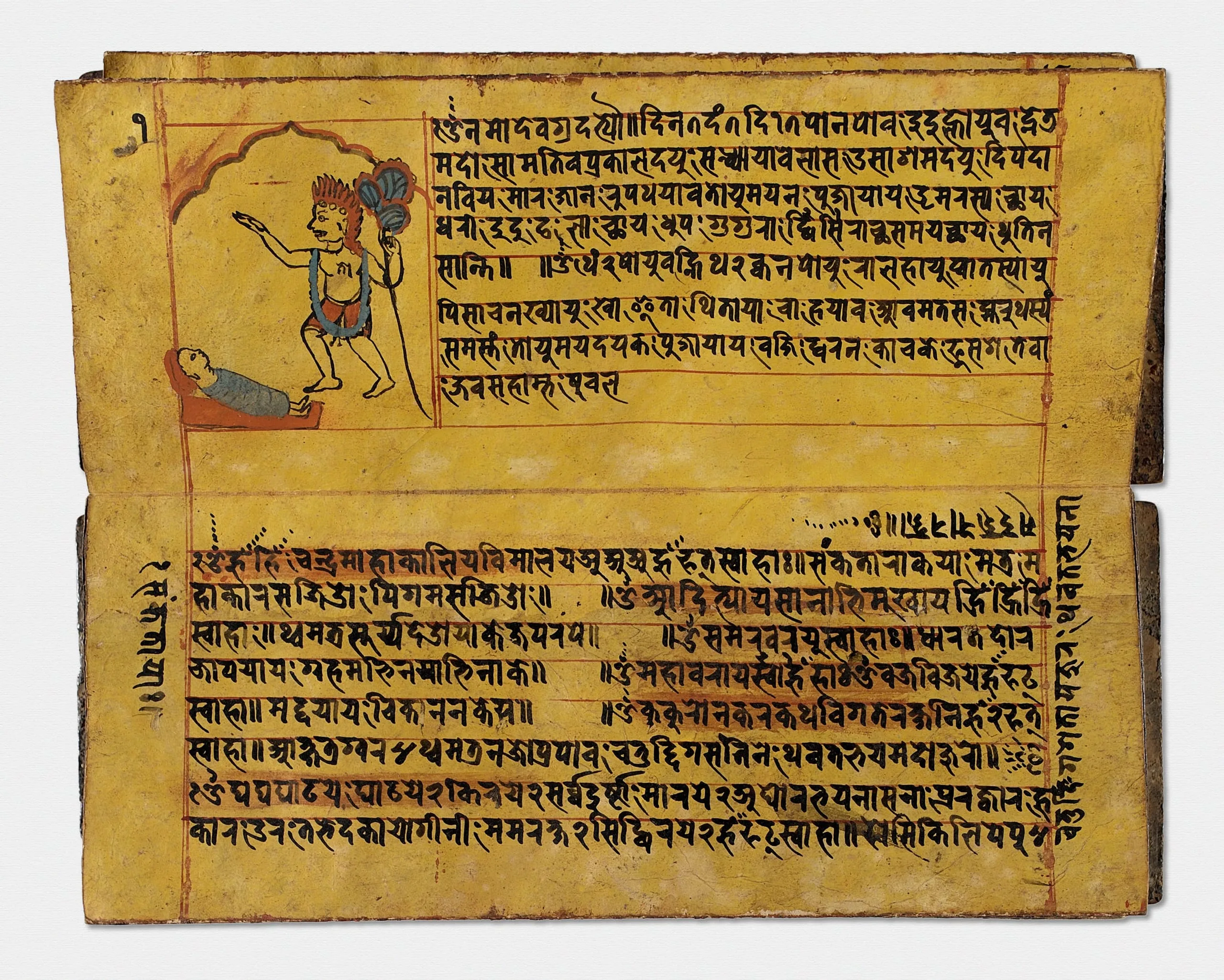 - Opaque watercolor and ink on paper; wood cover with colored unguents