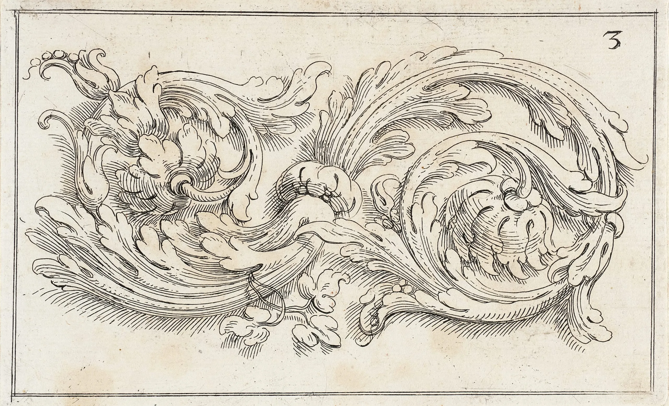 Horizontal print with fine black lines on cream paper, depicting scrolling acanthus leaf ornament with spiral foliage and a central puffed rosette form, numbered "3" in the upper right