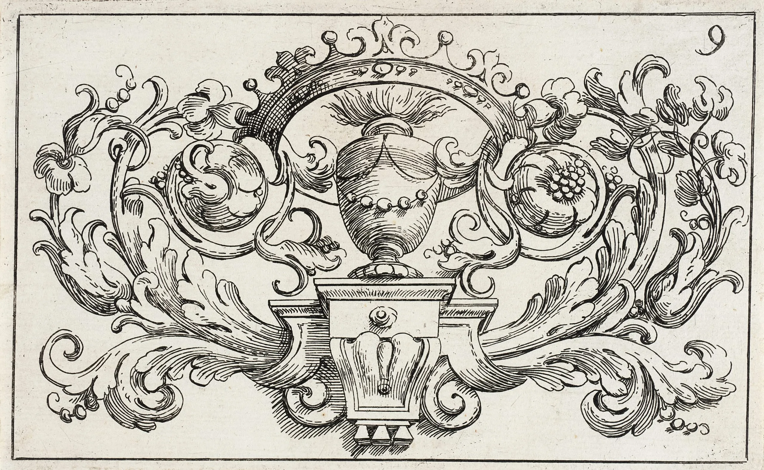 Engraving of a symmetrical decorative vignette with acanthus scrolls, a central draped urn on a pedestal, and a hatched arched frame, numbered 9 in the upper right