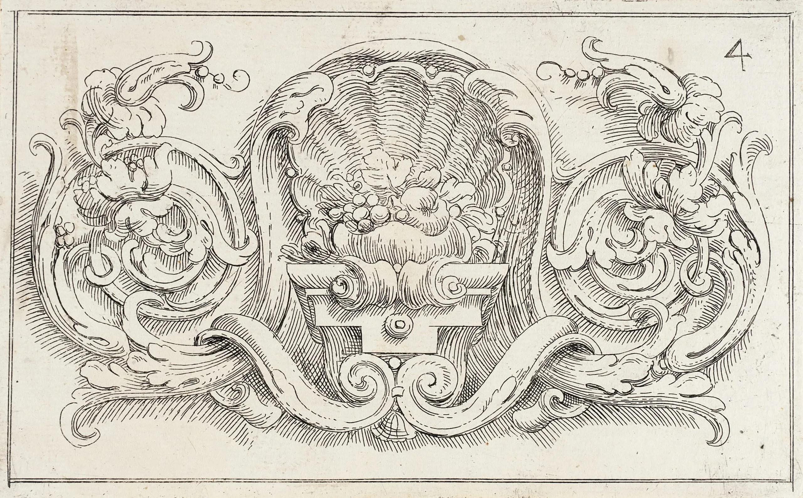 Engraving on cream paper of a symmetrical Baroque ornamental cartouche with a central scallop shell, fruit cluster, scrolling acanthus leaves, and strapwork, numbered "4" in the upper right