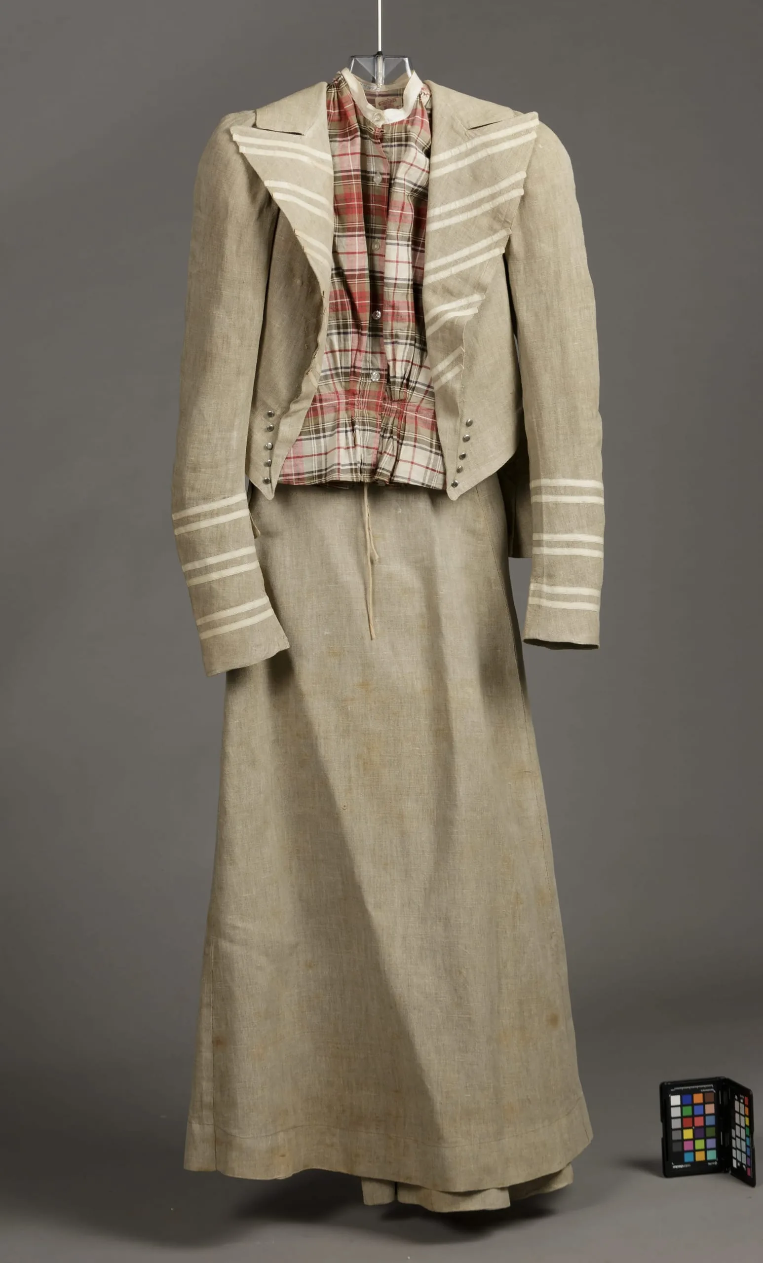 - Jacket: Linen plain weave with cotton plain weave ribbon with cotton supplementary warp patterning, and metal