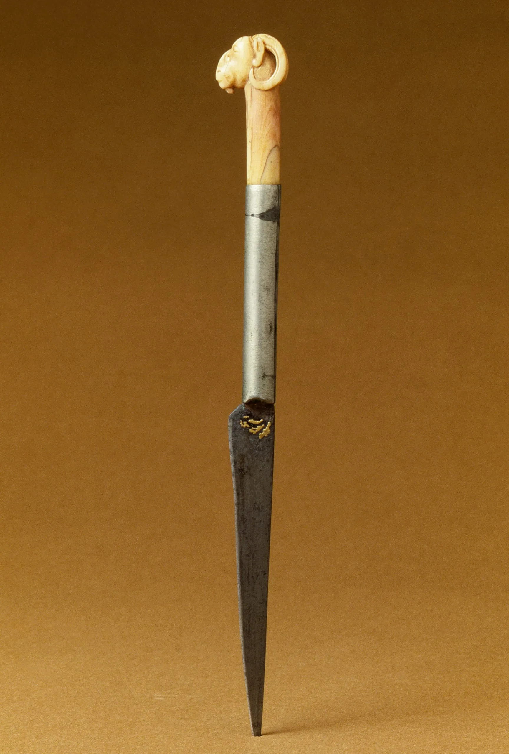 This small knife with a single-edged straight blade is a type of knife or dagger known generally as a kard. Its diminutive size suggests that it may have been used by a lady of the court, perhaps to cut fruit. The ivory terminal in the form of a wild goat’s head is sensitively portrayed with its distinguishing goatee, curled horns, upright ears, and a short, angular snout. For a comparison of anatomical features, see a slightly earlier ram's head hilt made of jade (M.76.2.12). The base of the iron blade has an undecipherable inscription or decorative pattern inlaid in gold.