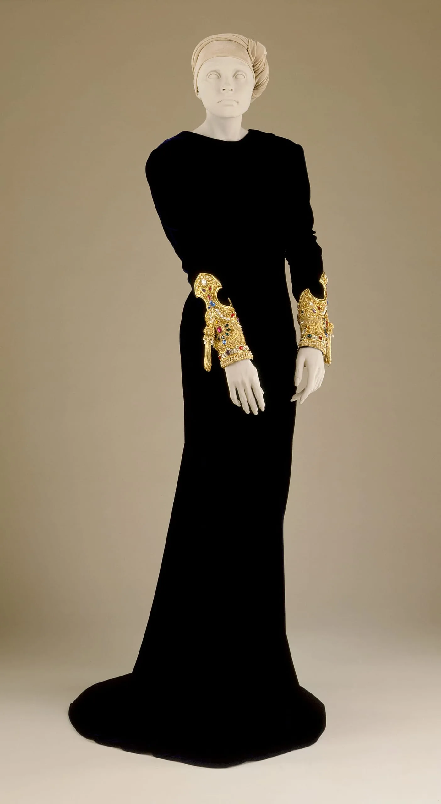 - Silk velvet, metallic-plastic strip, metallic wrapped thread, glass bead, faux pearl embroidery, with prong set chrystals.