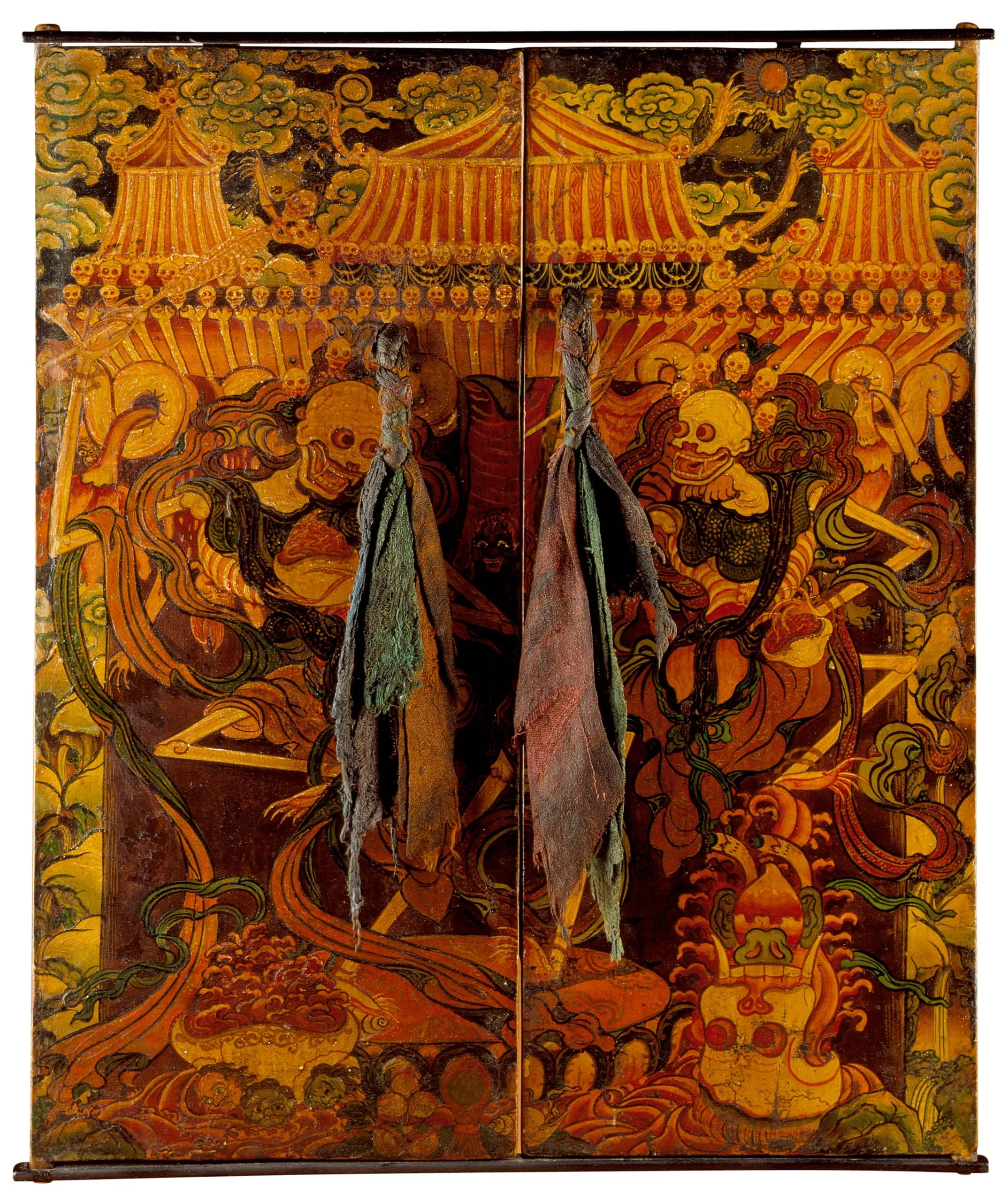 These elaborately painted doors from an offering cabinet (torgam) are adorned with dancing skeletons (chitipati; ‘lord of the funeral pile’) who cavort on a lotus base beneath Tibetan pavilions made of human skulls and bones. The grinning skeletons wear skull crowns and ornate robes and scarves. They each carry a ritual staff topped with a skull (khatvanga; ‘cot’s leg’) and a skull cup (kapala) made from human craniums and filled with symbolic offerings of blood and body parts. Behind them is a wall draped with festive swags of flayed skins and entrails emphasizing the association with charnel grounds. In the foreground are a large blood-filled skull cup and an inverted demonic skull with fangs containing the dismembered eyes, ears, tongue, and heart of one’s enemies. See Robert Beer, The Encyclopedia of Tibetan Symbols and Motifs (Boston: Shambala Publications, 1999), pp. 311-315, pls. 135-136. See also M.86.127, M.2002.209, M.2010.78.16, and M.2017.180.1.