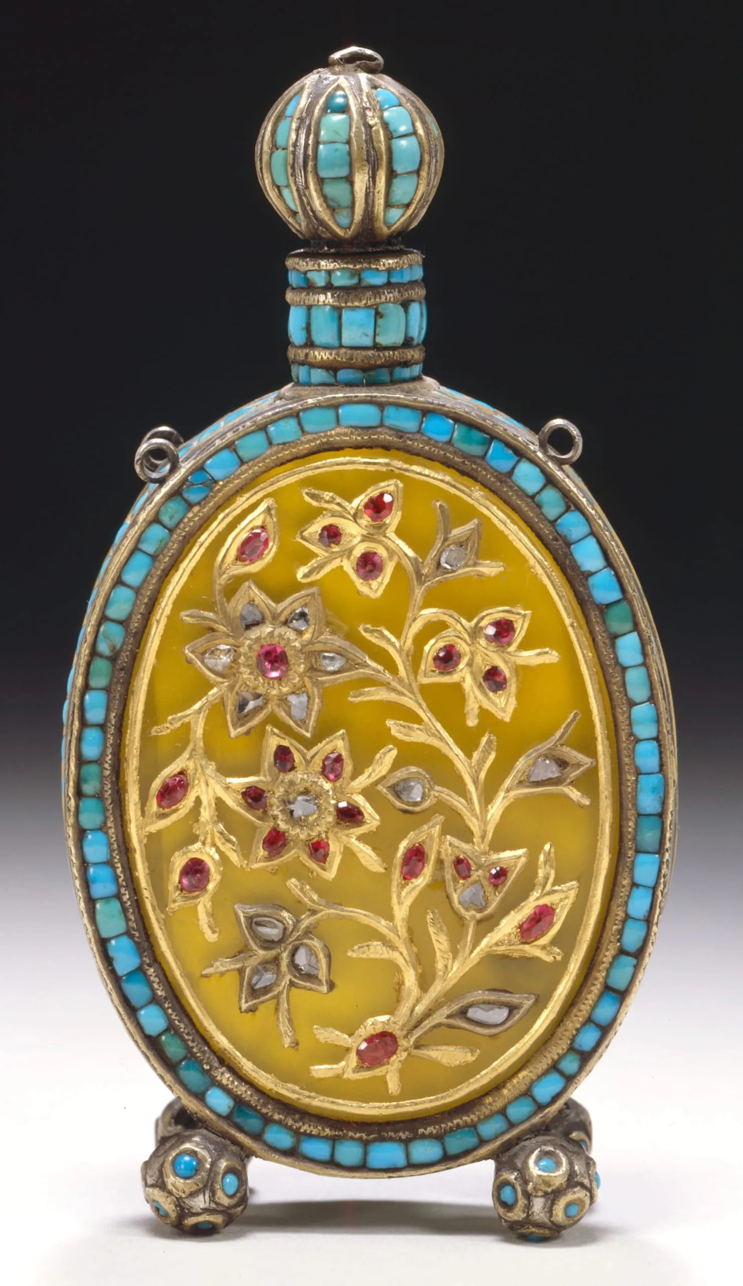 The front and backs planes are inset with an oval-shaped piece of yellow quartz, which is a distinctive but atypical material in the genre of South Asian decorative art. It is embellished with the Mughal flowering plant leitmotif in its late stylistic manifestation of a matrix-like composition of inlaid gold branches with blossoms formed by faceted diamonds and rubies set in gold. The use of the motif functioned to proclaim the vessel’s Mughal origin.