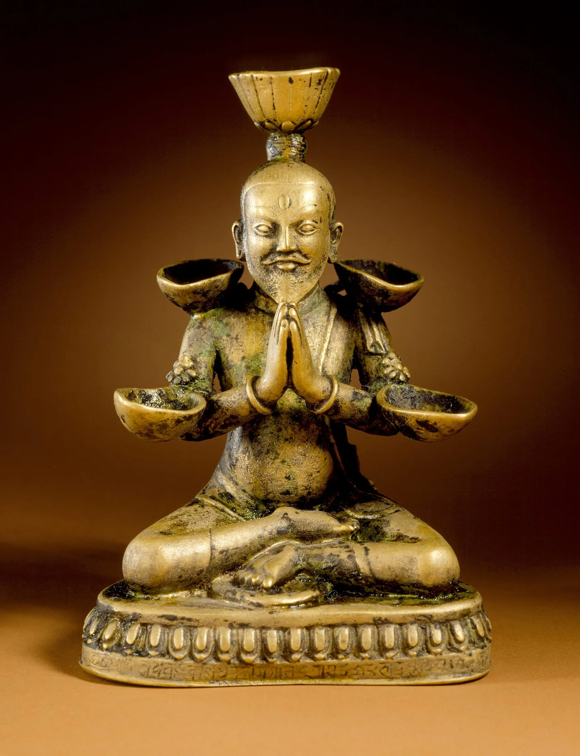 Ritual oil lamps have long been used in South Asia for Hindu and Buddhist religious ceremonies and social rites for weddings, birthdays, and death observances. They are typically made of brass and burn mustard oil in small burner dishes used to contain the oil and a floating wick. Nepalese figural oil lamps are often cast in the form of donors, such as two examples in the UCLA Fowler Museum of Cultural History, Los Angeles (X2001.11.101 and X2001.11.103). They can also be adorned with the deities invoked in the ritual (see M.2011.136).