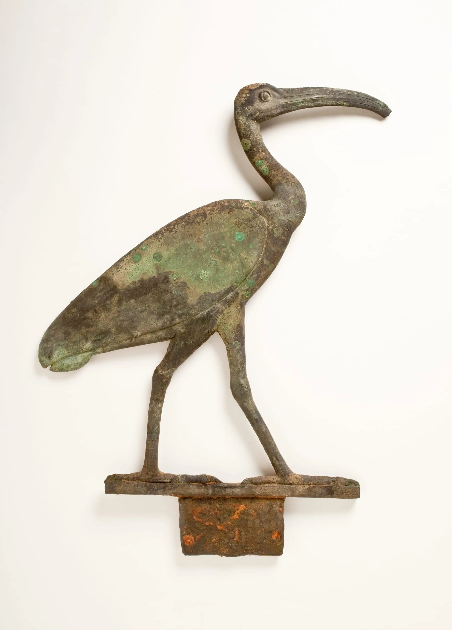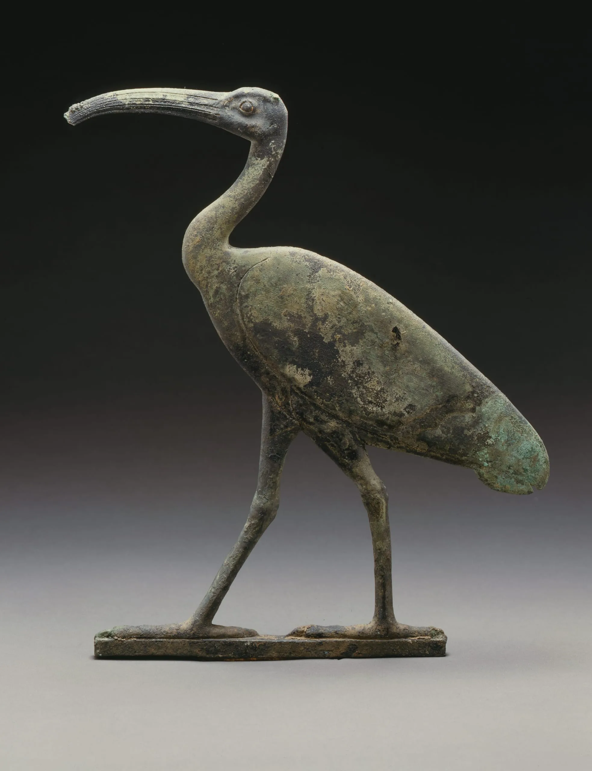 This ibis image was probably attached to a staff in order to create a standard (a type of banner) that would have been carried by priests or government officials in religious processions or parades. Very few examples of processional standards survive, although their importance in public processions is demonstrated in illustrations on Egyptian monuments and sculpture. This standard dates to the Late Period (712 - 332 BC). Although the standard seems flat, it was designed as a three-dimensional object. The skill of the artist who created this bronze is evident in the elegance of the outline and contour and the attention to detail. Late Period bronze production reached its peak during the Twenty-sixth Dynasty (664 - 525 BC), a likely date for this object.
