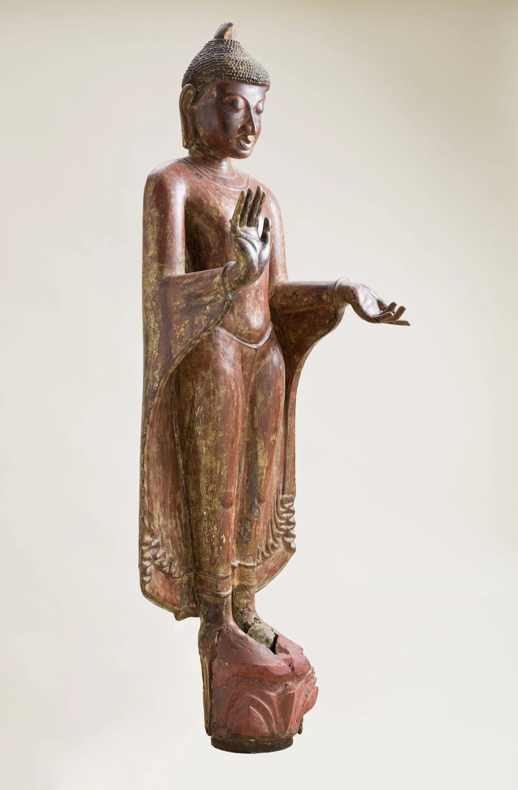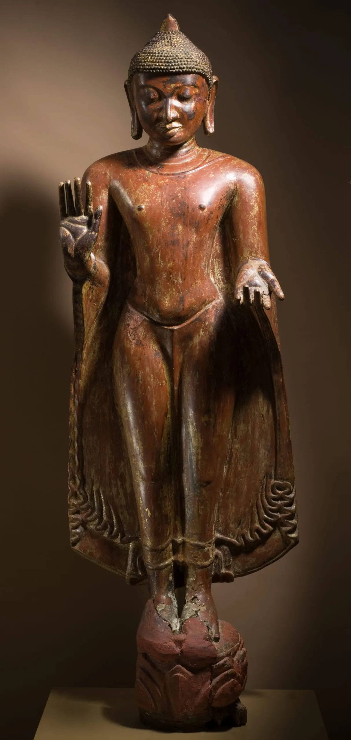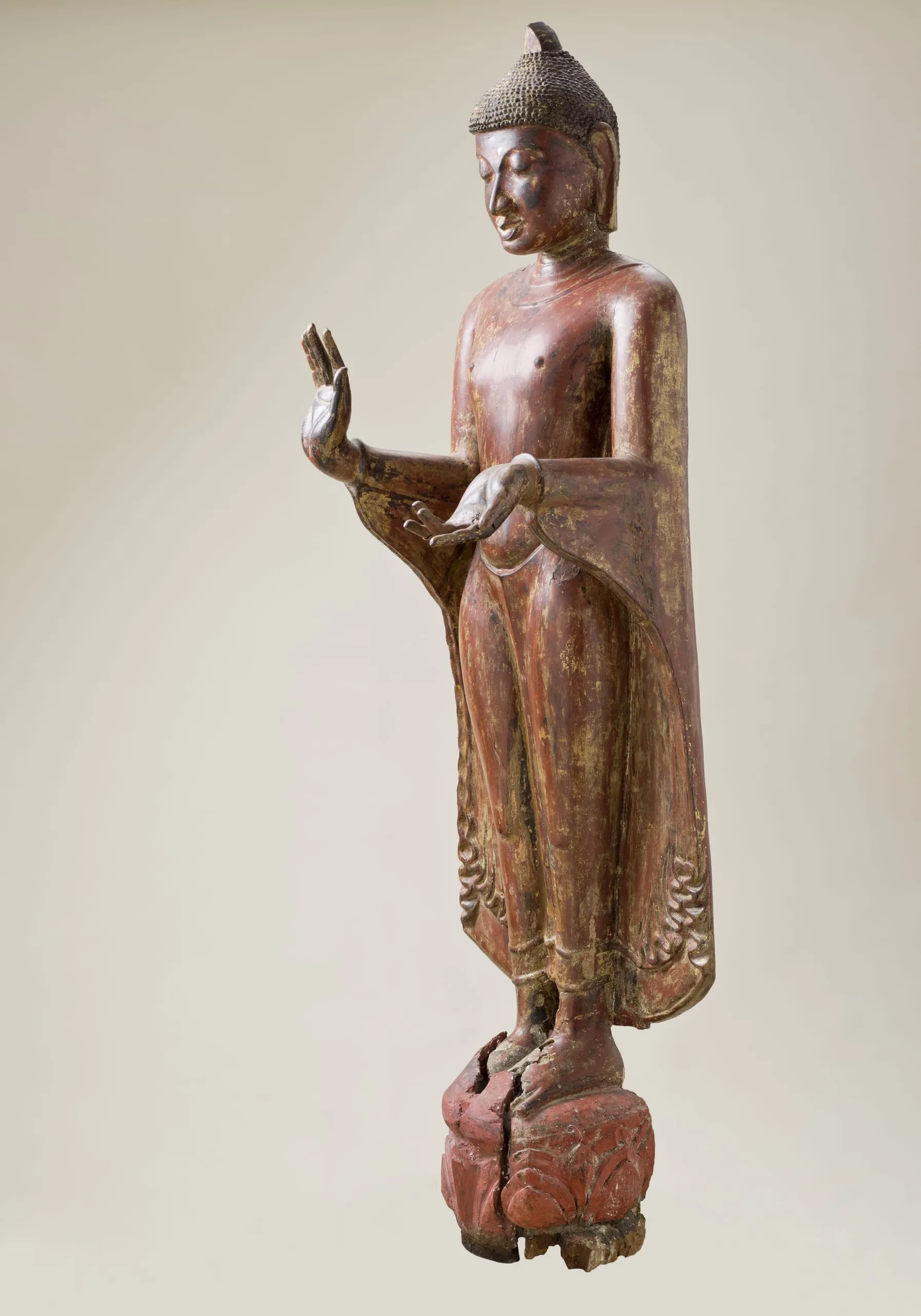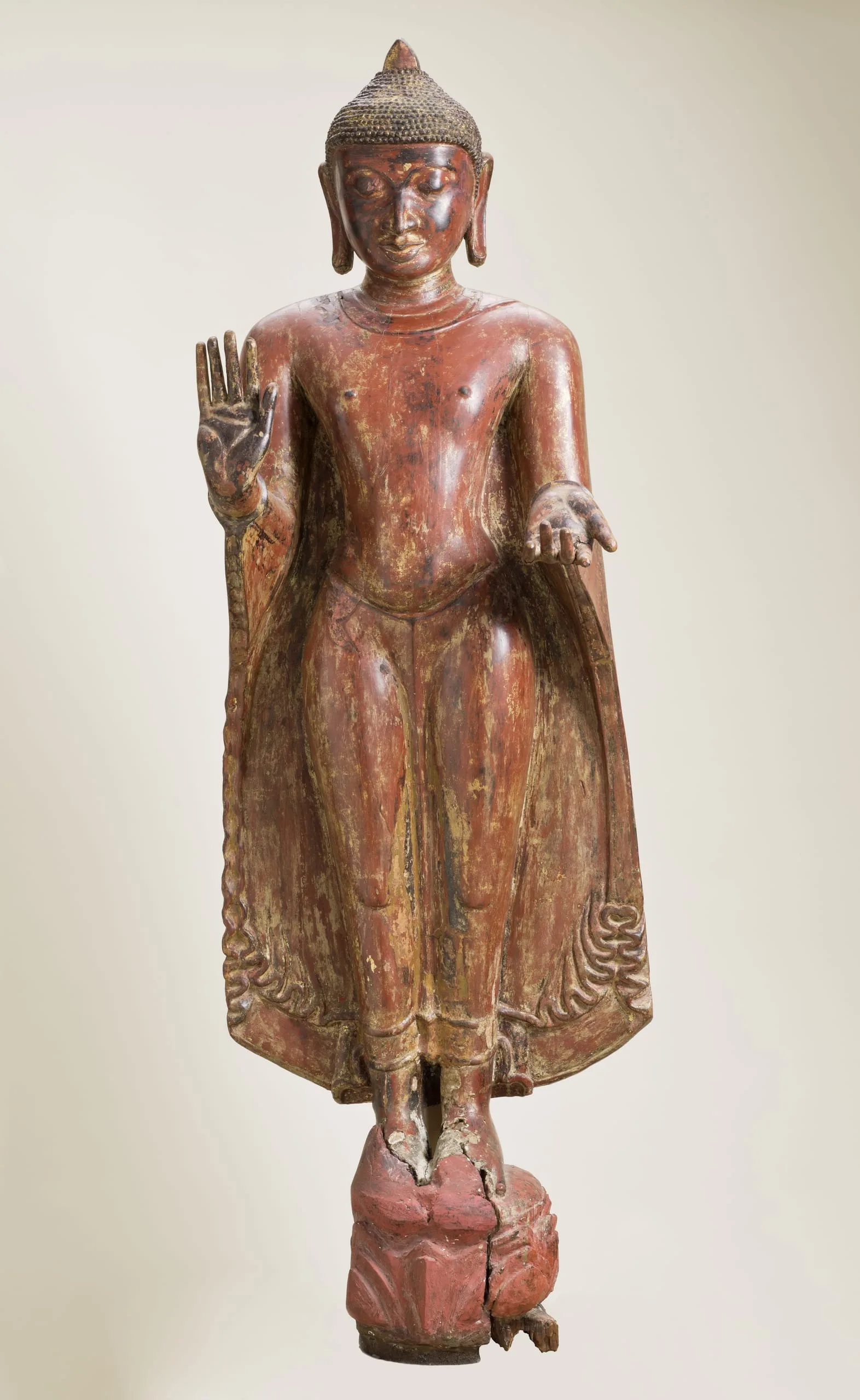 This large standing Buddha Shakyamuni was made during the Pagan period during a major florescence of Burmese art. It is a rare extant image made of wood in a style more commonly associated with contemporaneous copper alloy and stone representations. He has the standard iconographic features of snail-curl hair and elongated earlobes. His right hand is held in the gesture of reassurance (abhaya mudra). His left hand is a replacement that is extended with the palm turned upward. The original hand likely held the hem of his robe. Radiocarbon analyses date the head to 1100-1250 and the separately made body to 668-962 CE, suggesting that the overall sculpture was created at the time the head was carved with a body made from a much older tree. (Brown 2013, Artibus Asiae 73:1, pp. 220-222, figs. 1-2)