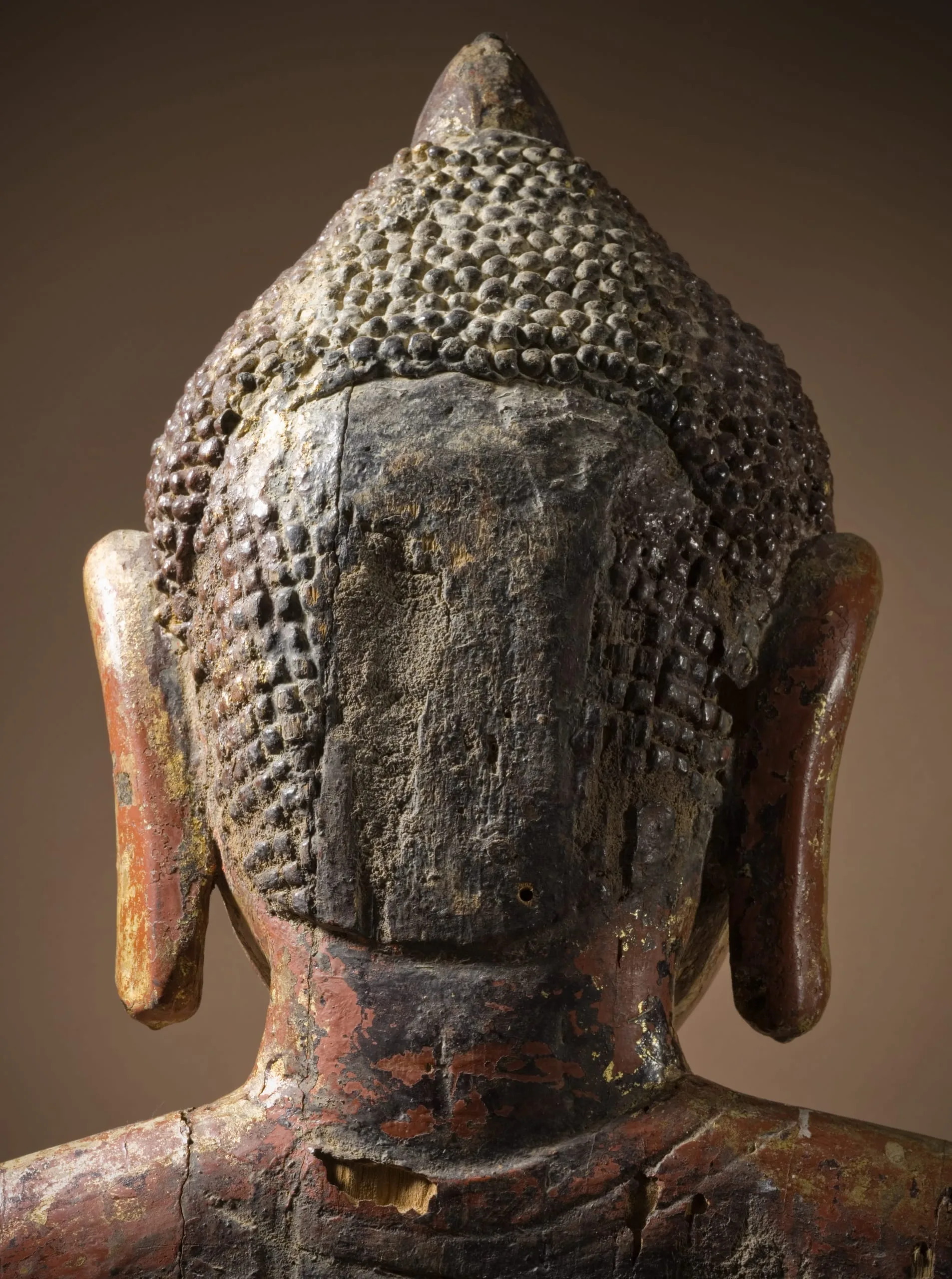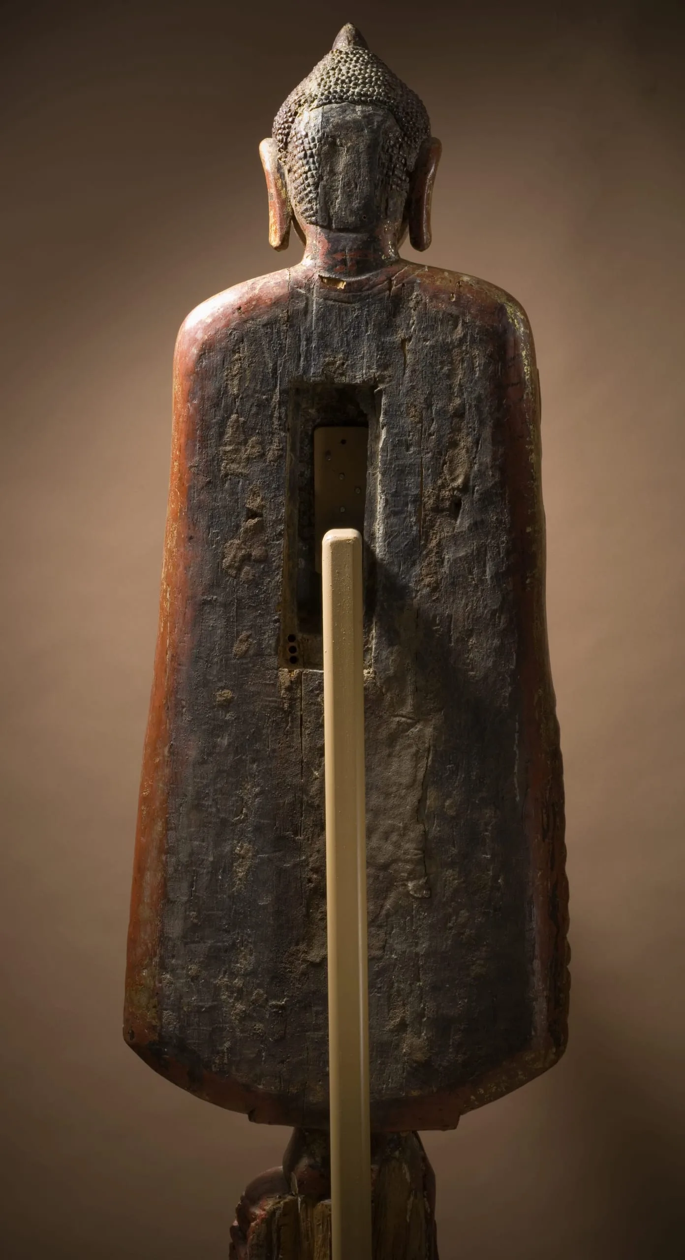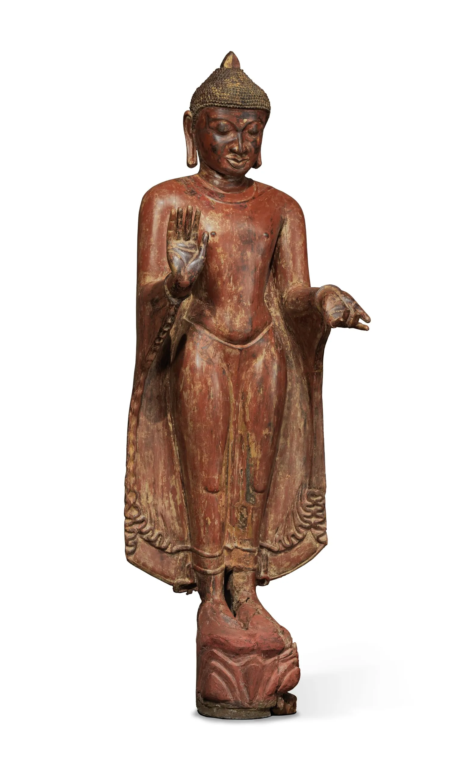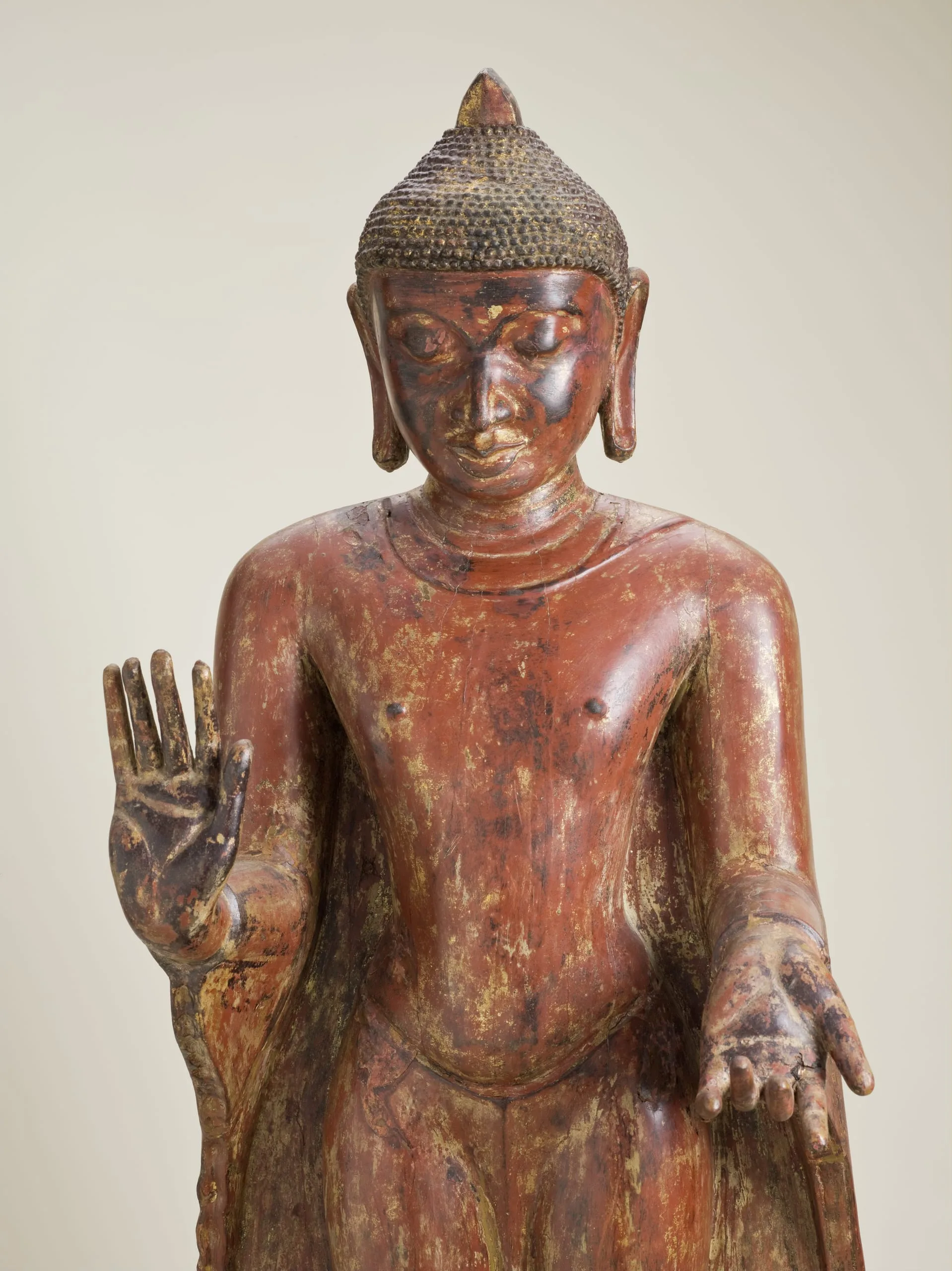 This large standing Buddha Shakyamuni was made during the Pagan period during a major florescence of Burmese art. It is a rare extant image made of wood in a style more commonly associated with contemporaneous copper alloy and stone representations. He has the standard iconographic features of snail-curl hair and elongated earlobes. His right hand is held in the gesture of reassurance (abhaya mudra). His left hand is a replacement that is extended with the palm turned upward. The original hand likely held the hem of his robe. Radiocarbon analyses date the head to 1100-1250 and the separately made body to 668-962 CE, suggesting that the overall sculpture was created at the time the head was carved with a body made from a much older tree. (Brown 2013, Artibus Asiae 73:1, pp. 220-222, figs. 1-2)