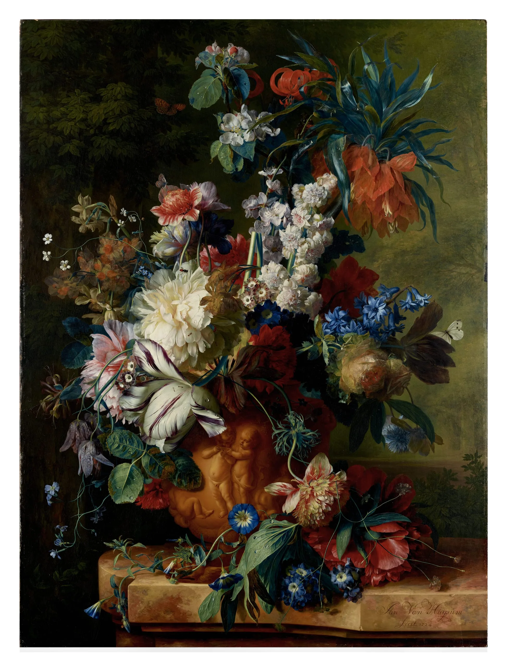 Jan van Huysum’s exuberant, asymmetrical bouquet of heavy blossoms overflowing a stone vase contrasts starkly with Ambrosius Bosschaert’s tight, symmetrical Bouquet of Flowers on a Ledge, painted one hundred years earlier. One of the most famous contemporary painters in Europe at the beginning of the eighteenth century, Van Huysum heralded the rococo in his preference for pastel colors and overblown flowers suspended by stems that form grace-ful arabesques. A Crown Imperial, the large, red flower at the summit of the bouquet, was highly prized by collectors.
