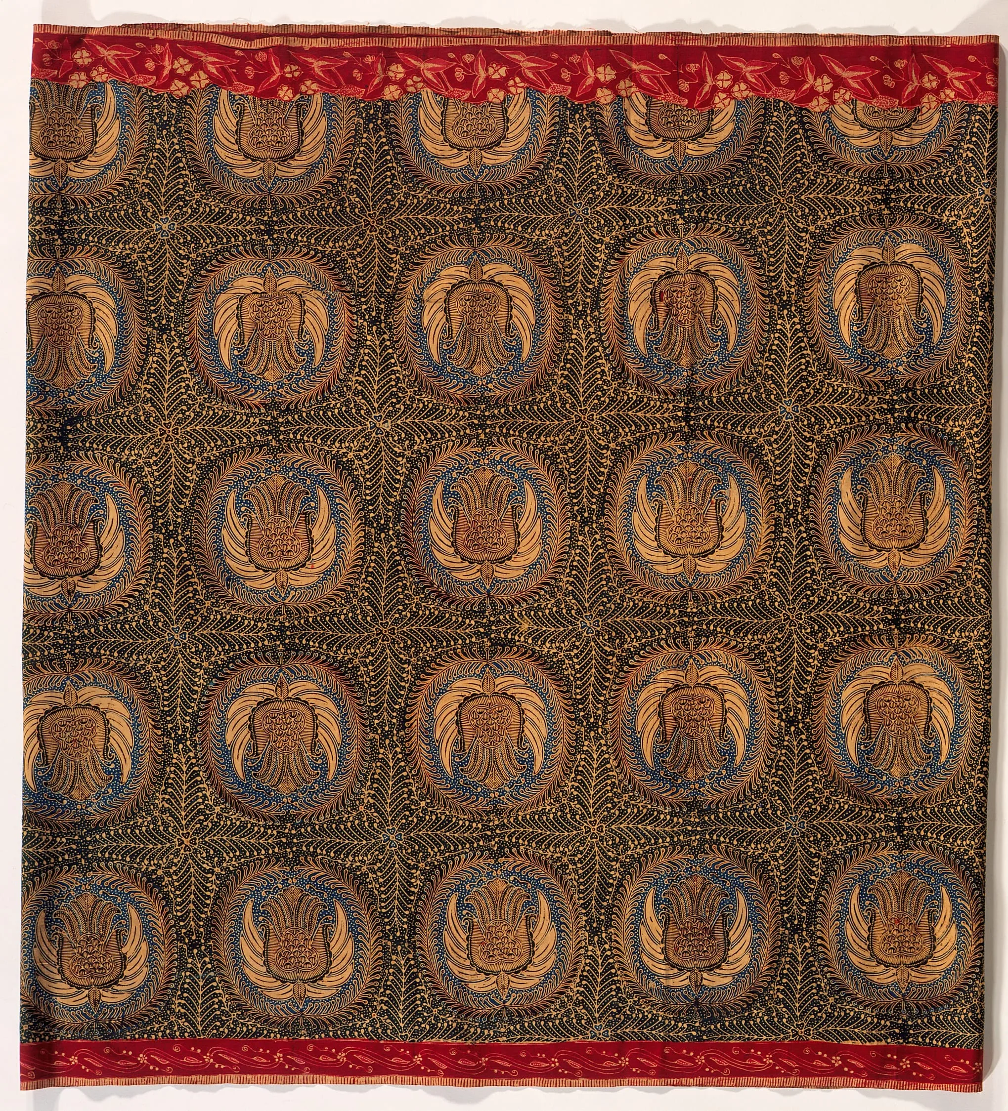 - Cotton plain weave, wax-resist-stamped and dyed (batik)