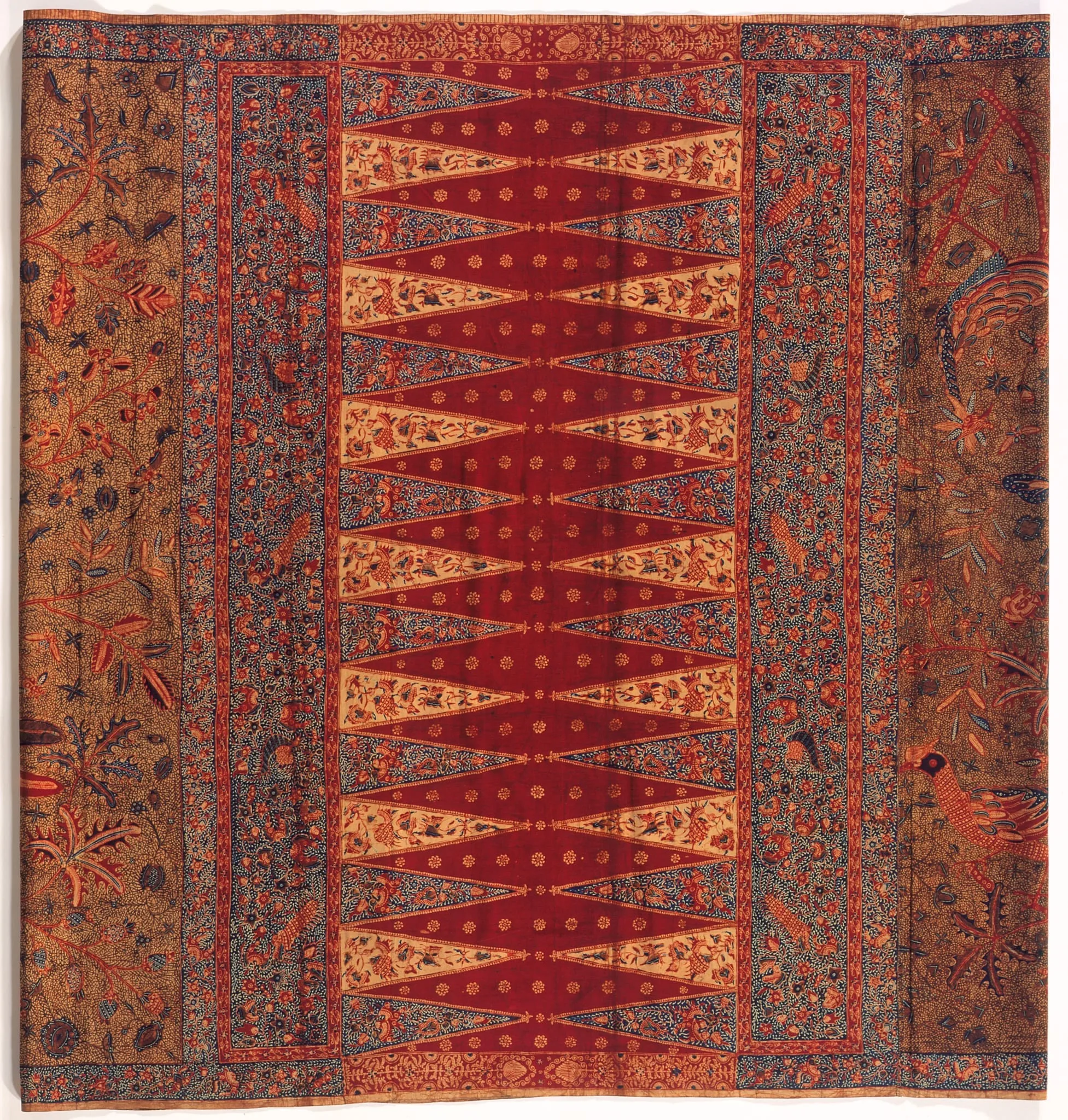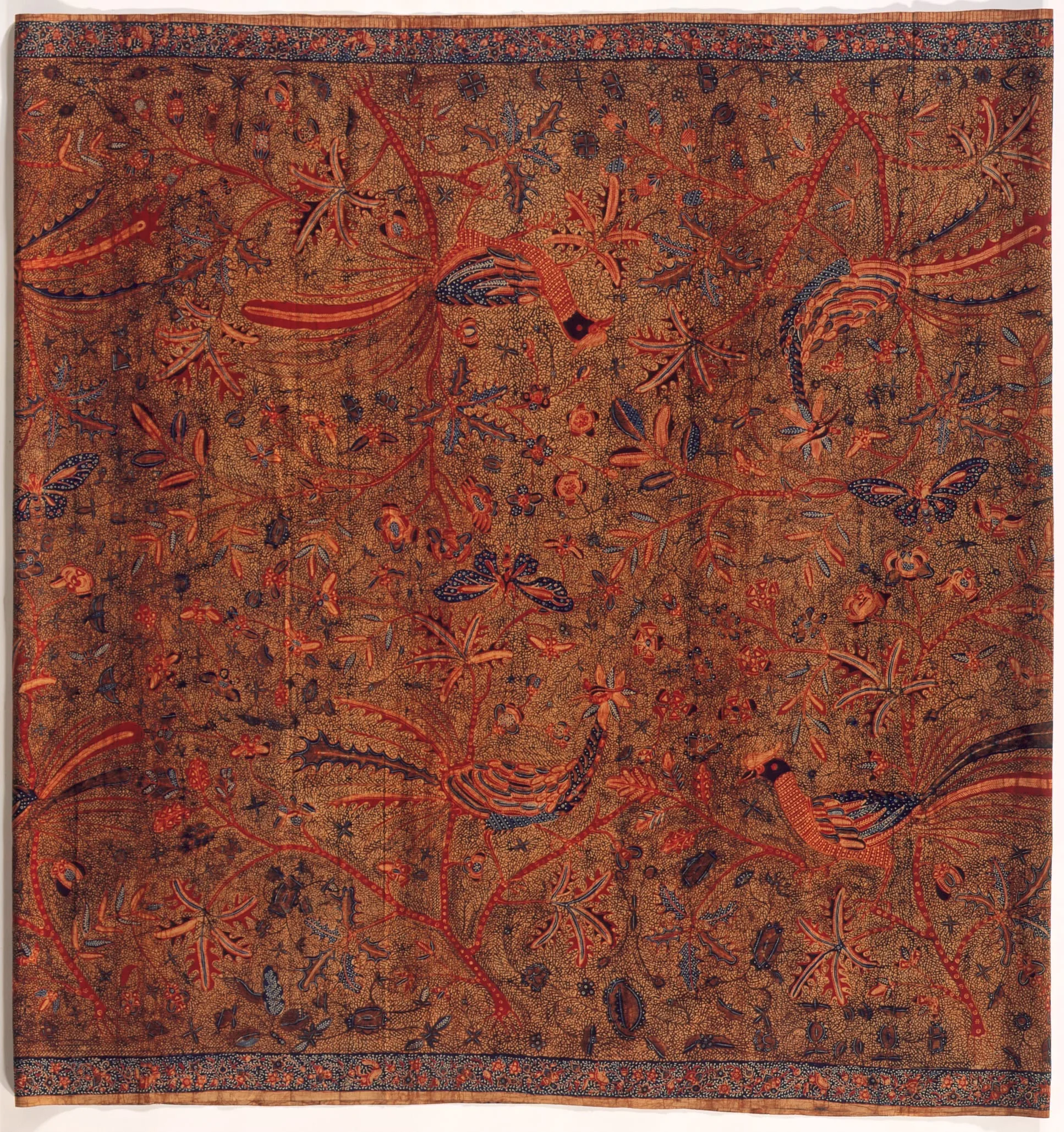 This elaborate batik, executed on heavy cotton cloth imported from England, is an early example of the tiga negeri style. The name tiga negeri (three regions) indicates that three different batik centers, in this case all on the north coast, contributed to its completion; the design and color styles fuse into a singularly prestigious batik. The cloth retains its tubular form, sewn together close to the kepala, where the seam would be invisible when the cloth was folded and worn. Six large birds with long tails perch clumsily on the branches of small, flowering trees, which owe a remote debt to Indian palempore. Butterflies, their wings outspread, flutter among the profuse vegetation, the effect of which is intensified by a background layer of reddish-brown, finely drawn tendrils (ungkeran). At first sight the main motifs appear to mirror each other along an imaginary horizontal line. An interesting vertical balance is attained by the arrangement of the male and female birds. Crested, seated males alternate with standing females, whose heads have turned into flowers. The kepala, with starflowers on a red ground formed by rows of opposing triangles, is in the traditional style, as is the papan, with its centipedes, fruit bats, and birds among small flowers. The symmetrical borders are edged with a plain upper and a finely striped lower selvage border (seret).