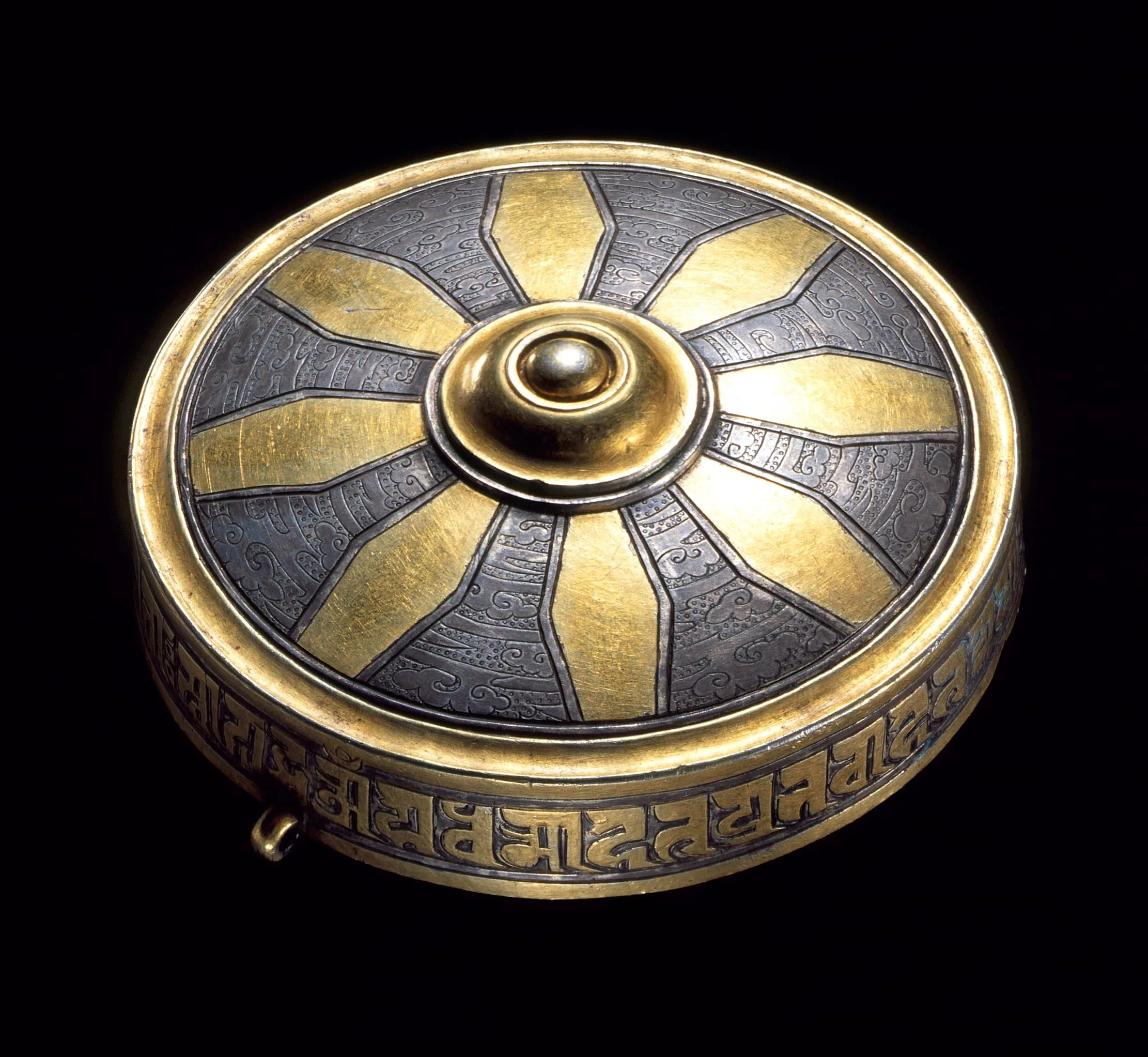 Probably representing the eight prongs of a thunderbolt (vajra), the exterior of the lid has eight gold lozenges on a silver ground with cloud patterns. The overhang is inscribed in Lantsa script with the renowned mantra known as the Buddhist creed, Om Ye Dharma Hetu Prabhava Hetum Tesham Tathagato Hyavadat Tesham Cha Yo Nirodha Evamvadi Mahashramana Svaha ("Of those things which proceed from a cause, of these the Tathagata has told the cause, and also how they come to an end. This is the teaching of the Great Renunciate").