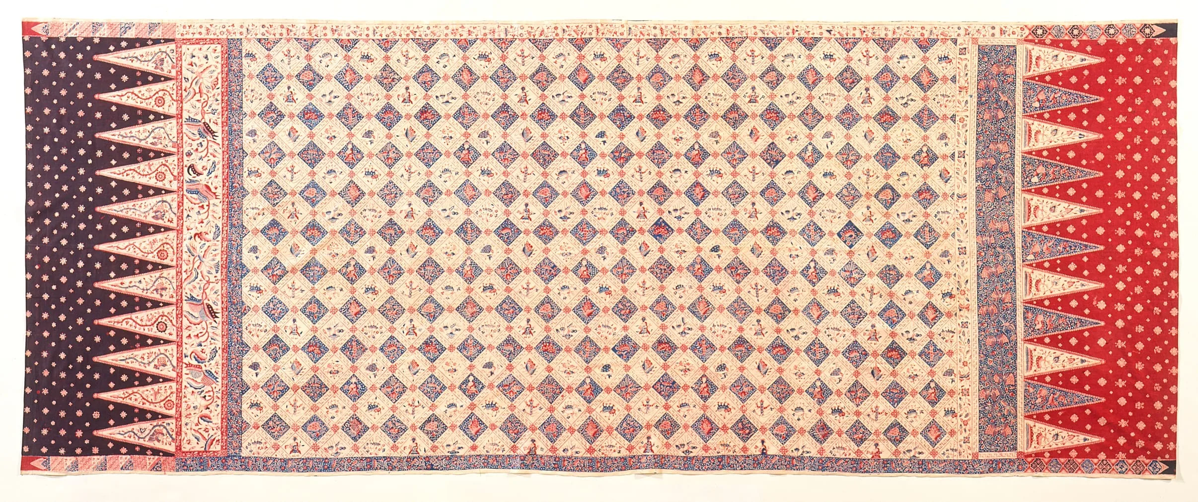 A very late example of the traditional asymmetrical Pasisir format, this cloth shows the motif kotak seribu (one thousand pigeonholes), exclusive to Cirebon. Connected through banji motifs, the blue lozenges alternate with white ones, which are adorned with yet another version of alas-alasan: scorpions, turtles, ¬ cattle, flowers, birds, and butterflies follow each other in neat rows. An unusual feature are the small human figures that alternate in contrasting colors: blue on white and white on blue. One of the papan shows only flowers. The fish that swim among the usual birds, insects, and flowers on the other end are often seen in batik from the fishing port of Cirebon. A portion of the border motifs above the kepala resembles motifs encountered on kain sembagi. They consist of diamonds crossed on the diagonal with a figure eight or large S form. The color is denoted as bang biru tiron Lasem (imitation of Lasem-style red and blue).1 Due to the availability of synthetic dyes the Lasem-style colors could easily appear on this typical Cirebon-produced batik.