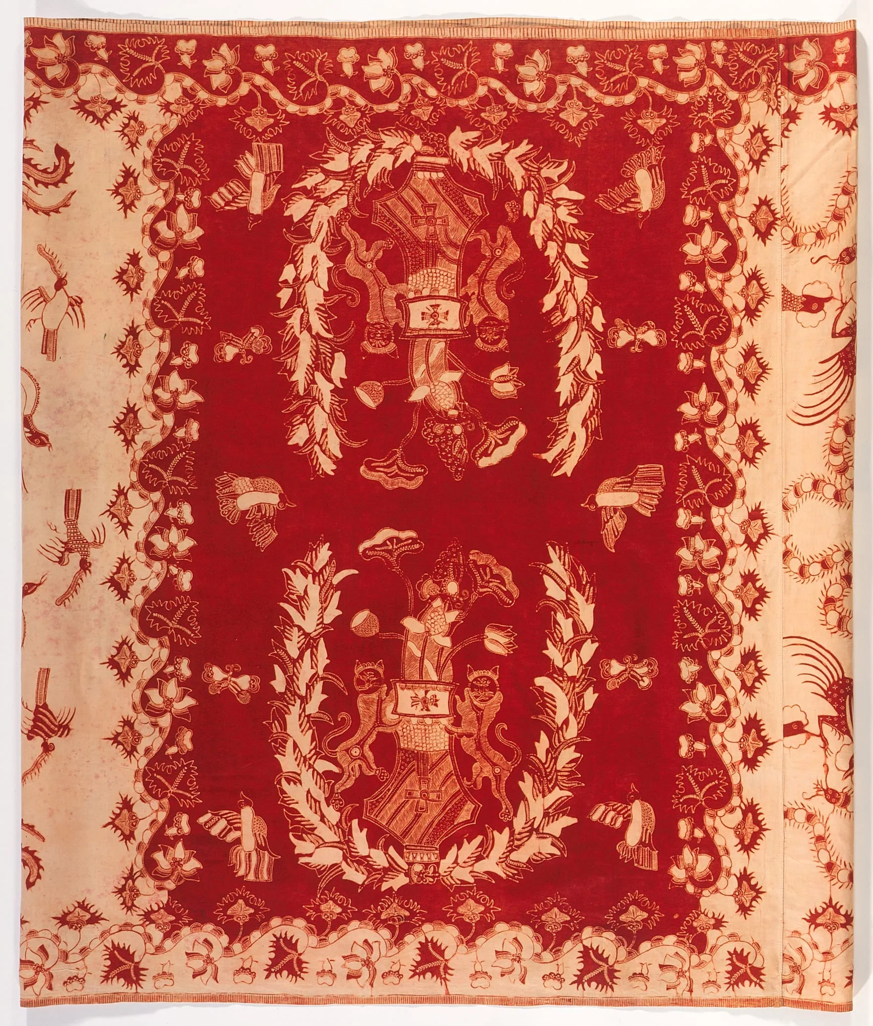 The horizontally mirrored halves of this tubular sarung’s badan teem with amphibians, birds, and other creatures, captured in lively poses. The kepala, once more with papan replaced by a border motif, is decorated with a coat-of-arms, similarly mirrored, with peculiar elements due perhaps to the unfamiliarity of the subject to the woman who drew the design. The escutcheon has become a vase of lotus flowers, embellished with a cross that resembles a medal. Like the Dutch coat-of-arms, it is supported by rampant lions that here look more like cats with swishing tails. The image is enclosed by an acanthus wreath. The asymmetrical borders are based on traditional Pasisir floral motifs, which have been combined into a lacy design in Indo-European style. The bang-bangan color scheme is reversed on the kepala.