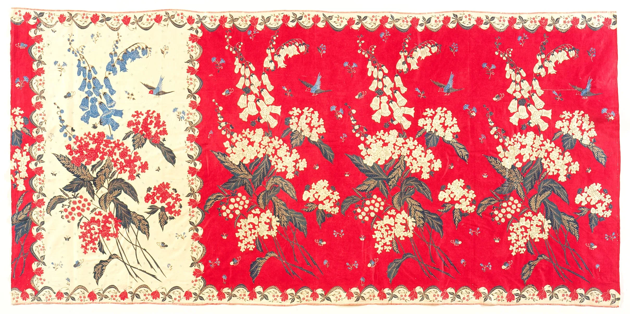 - Hand-drawn wax resist (batik) on machine-woven cotton, natural dyes